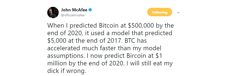 Digo literalmente porque hace poco publicó un tweet en el que anunciaba que si Bitcoin no llegaba a 1 millón de dólares a finales del 2020 se cortaría y se comería su propia picha.