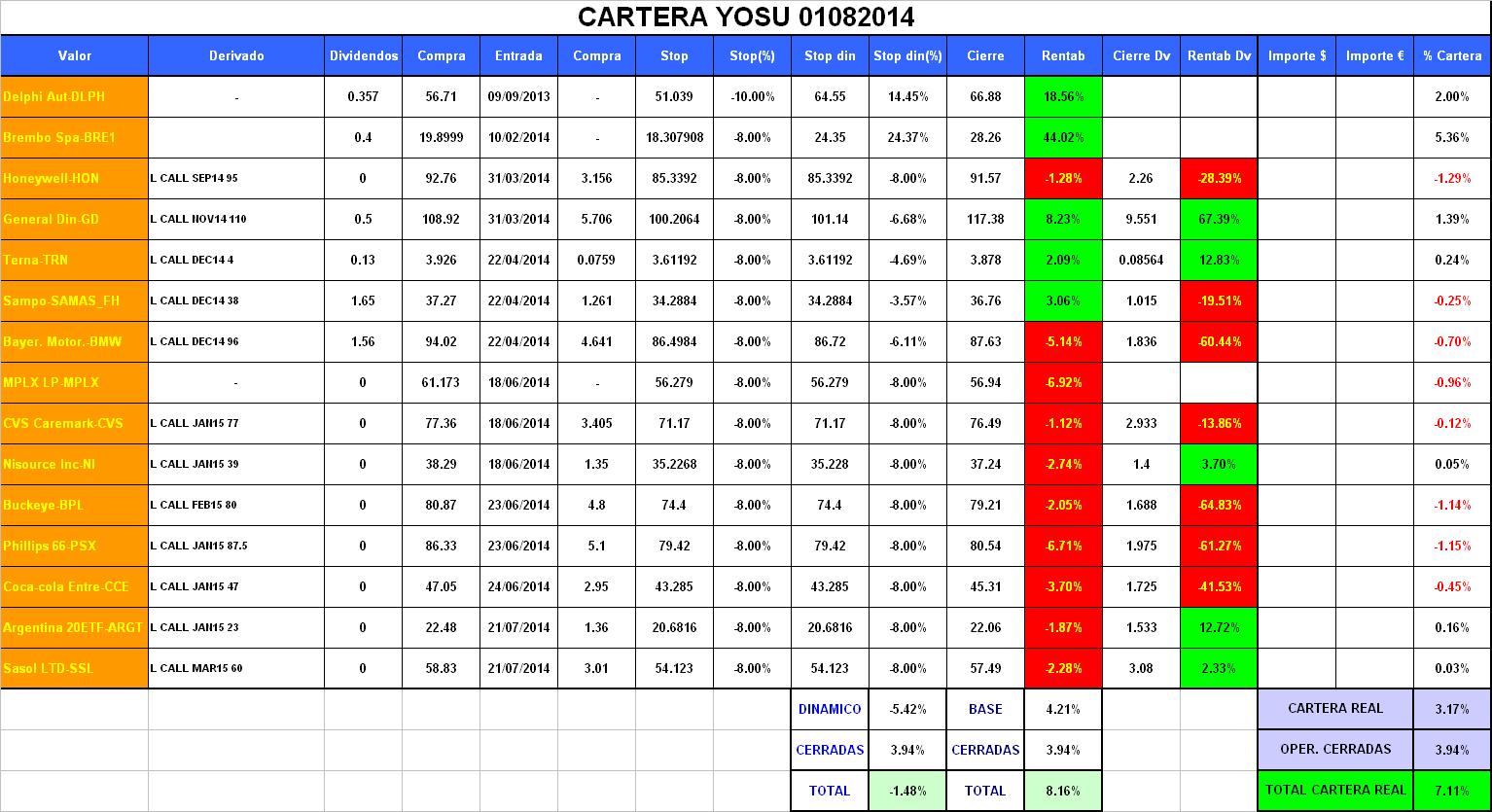 El total de cartera dinámica queda igual a -1,48%, en total cartera base y la cartera real empeoran fuertemente, en esta semana la cartera real vuelve a ponerse por debajo de la cartera base, +7,11% y +8,16%, bajando -6.81% y -4.70% respectivamente.
