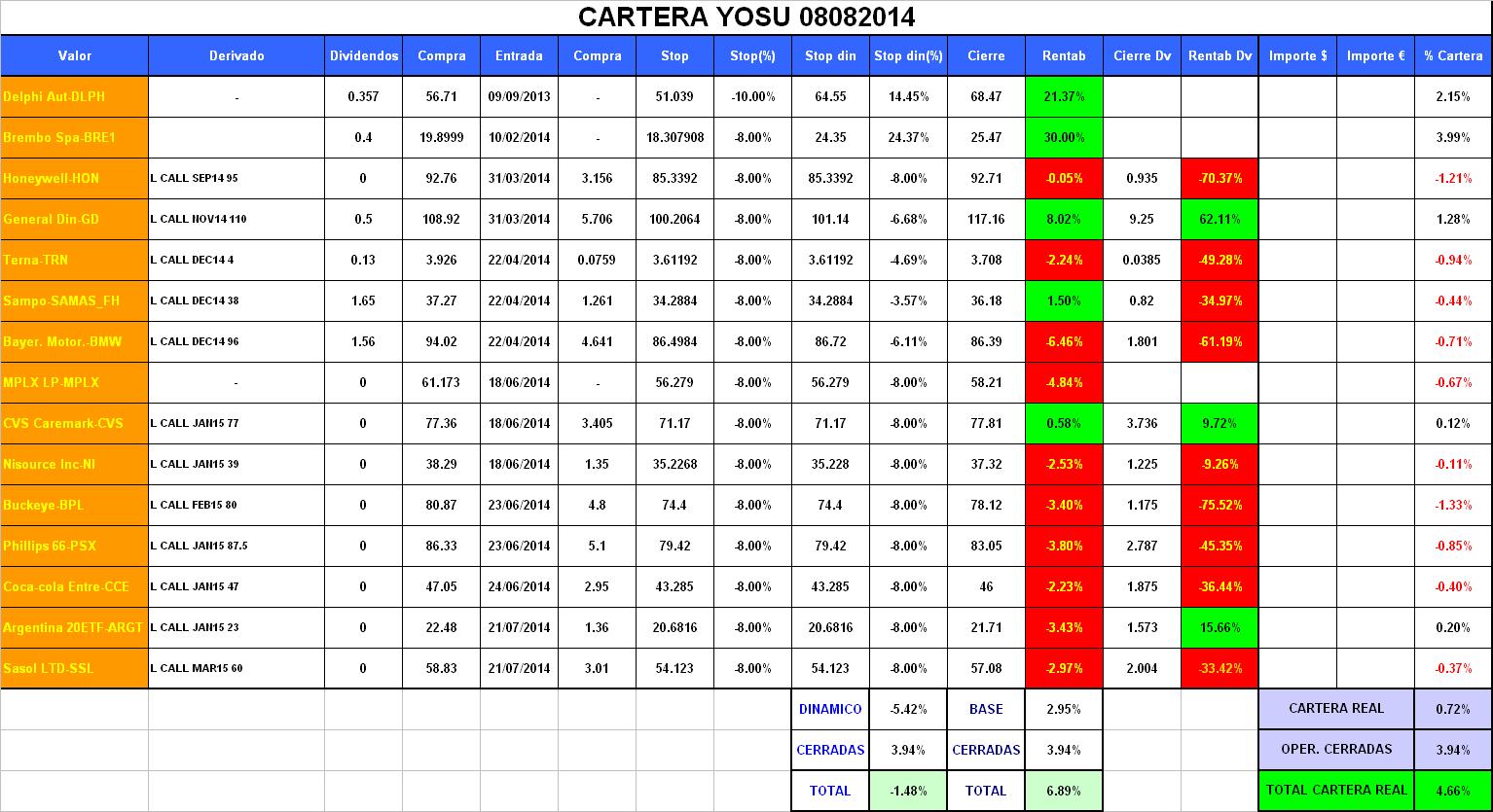 El total de cartera dinámica queda igual a -1,48%, en total cartera base y la cartera real vuelven a empeorar, la cartera real continua por debajo de la cartera base, +4,66% y +6,89%, bajando -2.45% y -1.27% respectivamente.