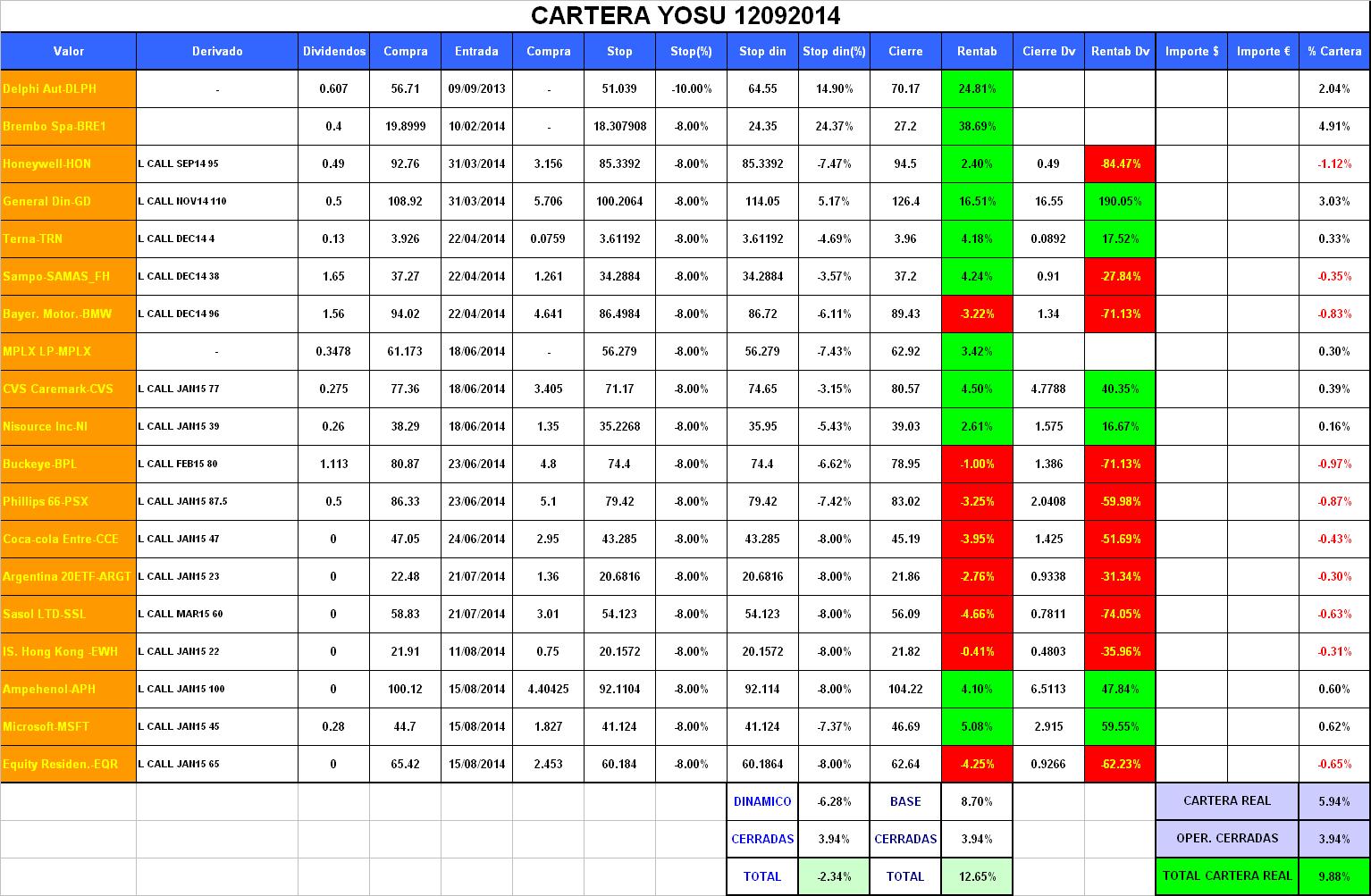 El total de cartera dinámica queda igual a -2,34%, en total cartera base y la cartera real también bajan, la cartera real vuelve a quedar por debajo de la cartera base, +12,65% y +9,88%, bajando -5.15% y subiendo -6,84% respectivamente.