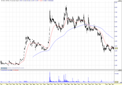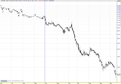 En primer lugar he de aclarar que AISA sí está en el mercado continuo, desde octubre de 2007, previamente estuvo unos 4 meses en fixing aburriendo a más no poder y cayendo en un suave goteo, lo cual podemos ver en el gráfico que no necesita presentación ni análisis puesto que es una incesante tendencia bajista desde su salida al mercado electrónico.