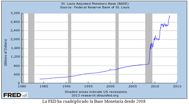 Todas estas circunstancias, aunadas a la actitud imperialista de Estados Unidos en ciertas latitudes, ha debilitado el interés de los re-emergentes en la deuda norteamericana. De este modo llegamos a una situación de difícil resolución… porque la pérdida de apetencia por los T-Bonds del Tesoro, ha obligado a la FED a cubrir parte de la demanda a través de sus programas de Quantitative Easing.