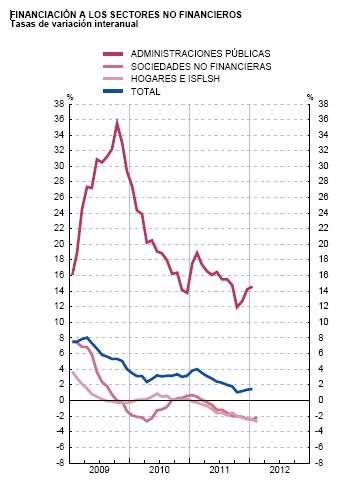 Es decir, las empresas y las familias, antes protagonistas del círculo, ahora nos limitamos a proveer de recursos a estos dos grandes bloques. Por si alguien cree que esto es una exageración dialéctica para hacer el post más interesante, propongo echar un vistazo al gráfico izquierdo, extraído de los últimos datos sobre financiación a familias y empresas, disponibles en la web del Banco de España. Desde que expliqué aquello del efecto crowding out, la cosa ha ido a peor.