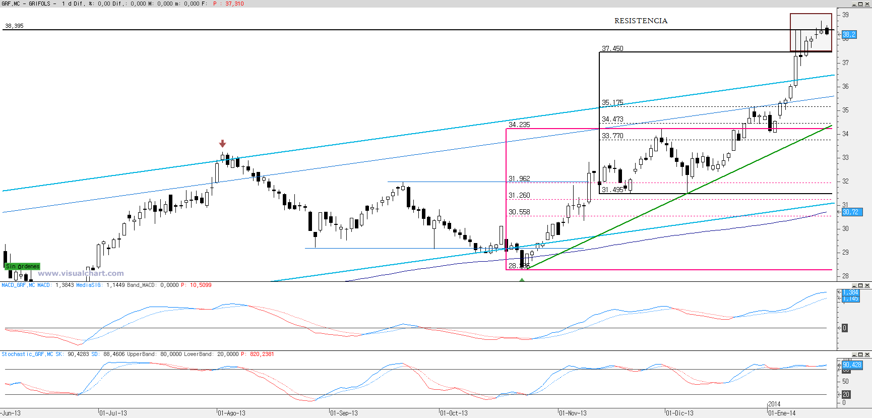 Las mencionadas mechas o sombras han actuado hasta este momento como resistencia, evitando que los alcistas cerraran por encima de dicho nivel, en concreto los 38,40€. Por otro lado la mencionada pauta de estrella fugaz y su confirmación formarían un patrón de dos velas y de nombre envolvente bajista, pues el cuerpo de la vela del viernes cubre totalmente el cuerpo de la vela del jueves. A los seguidores de los patrones harmónicos les comentaré que el segundo impulso alcista de Fibonacci corresponde al patrón clásico AB=CD. La posibilidad de encontrarnos con un tercer impulso es probable pero estadísticamente menos probable pero en caso de confirmarse esta posibilidad estaríamos ante un patrón AB=CD extendido o tercer impulso alcista de Fibonacci. Como he dicho esta posibilidad es posible pero no sería extraña una cierta corrección para continuar con los ascensos. Por lo tanto no considero interesante abrir posiciones alcistas si operamos en el corto plazo y en caso de mantener posiciones largas deberíamos cerrarlas con una perdida en cierre de los 34,065€ y si operamos tendencialmente mientras no se pierda en cierre los 31,515€. De producirse una corrección para activarse los patrones anteriormente citados necesitaríamos que estas no fueran más allá de los 34,73€, este hecho desmontaría la posibilidad de un tercer impulso alcista y veríamos caídas más profundas. Si hemos observado el gráfico adjunto podemos ver como Grifols viene moviéndose en un canal alcistas el cual fue roto a alza la semana pasada, sin producirse un throw back que aunque no es necesario suele ser una nueva oportunidad para posicionarse o aumentar posiciones alcistas.