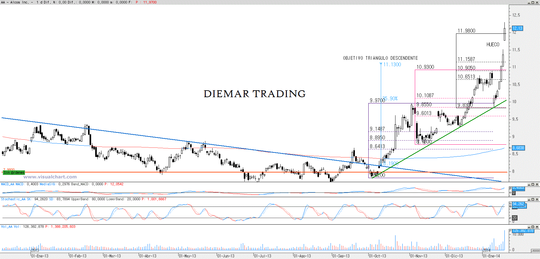 Así tenemos que Alcoa tras una fuertísima caída encontró soporte entre los 7,98$-7,80$, formándose desde enero de 2012 hasta octubre de 2013 un patrón de triángulo descendente y cuya ruptura alcista in extremis inició la formación de máximos y mínimos ascendentes, permitiendo vislumbrar una tendencia alcista de corto plazo. Sin embargo el hueco alcista de ayer es de vital importancia para definir hacia donde se dirigirá este valor. ¿Estamos ante un hueco de agotamiento o de continuación? Es la gran pregunta que debemos formularnos en este momento y por tanto habrá que estar muy atentos. La anulación de dicho hueco daría alas a las hordas bajistas y sería una señal clara para cerrar posiciones largas en el caso de especuladores de corto plazo, los inversores deberían estar atentos bien a un cierre por debajo de los 9.824$ señal inequívoca para cerrar posiciones largas o bien en el caso de que nos encontremos con una secuencia de dos máximos descendentes y obviamente un mínimo descendente.