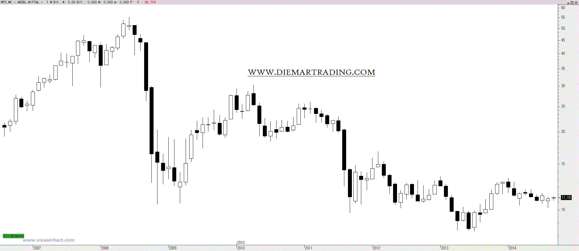 ArcelorMittal. Gráfico mensual. Escala logarítmica.
