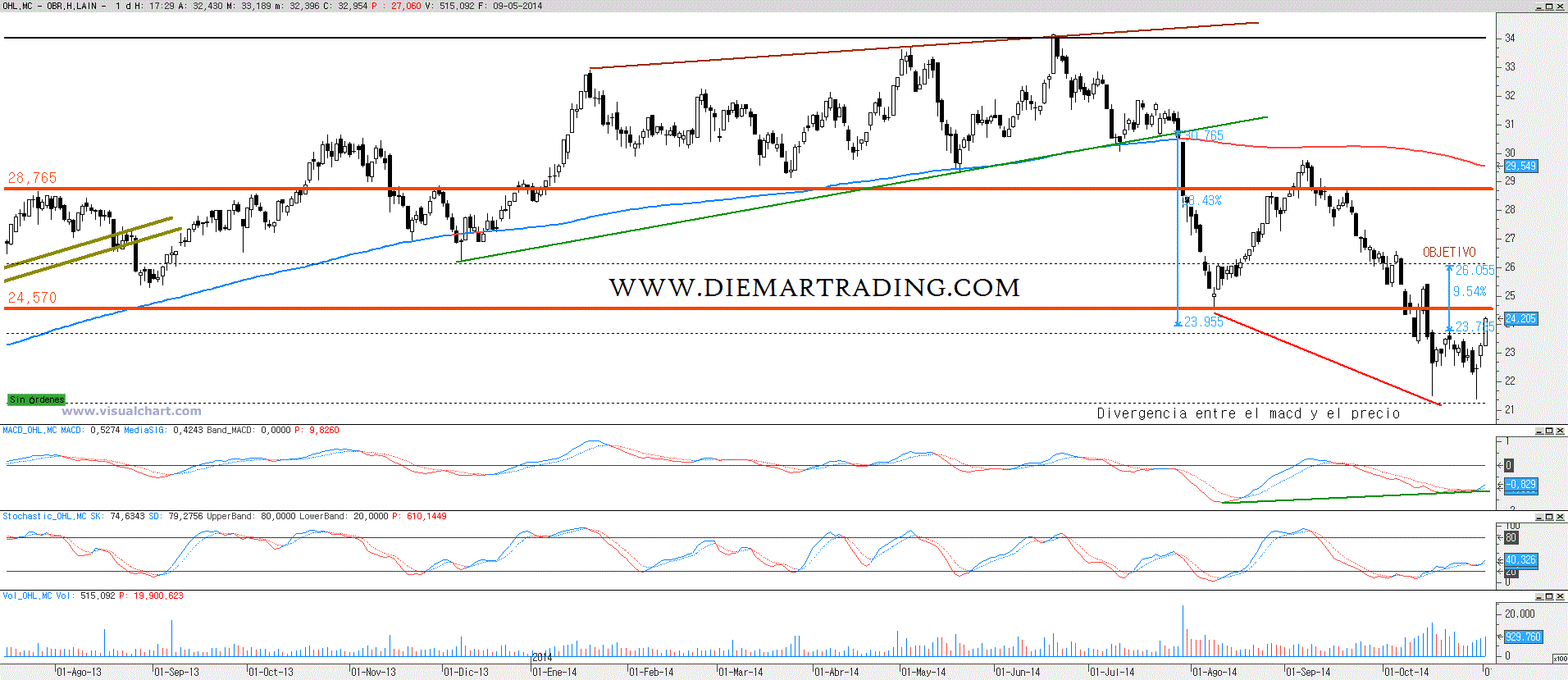 Tenemos dos largas sombras (mechas), estas son mínimos a un nivel muy próximo y entre estos tenemos una cresta. Obviamente la posibilidad de un doble suelo estaba en el gráfico. No obstante, este patrón necesita una confirmación, pues de lo contario podríamos encontrarnos con un movimiento lateral (consolidación). La respuesta a si estábamos ante un doble suelo o lateral llego al cierre de la sesión de ayer 3 de noviembre. Cuando al cierre confirmaba la superación de los 23,755€, la cresta entre los mínimos. Este hecho ha sido importante pues podríamos tener un cambio de tendencia en el más estricto corto plazo pero sin dejar de ser precavidos. El cierre de la sesión de ayer se efectuó casi ene l máximo intradía mostrando claramente la fortaleza alcista y si nos fijamos en el volumen aunque este no es excesivo si podemos constatar como este ha ido aumentando paulatinamente sesión tras sesión. Para no explayarme más me centraré en el citado doble suelo que como he dicho anteriormente ha sido confirmado, nos muestra un objetivo teórico mínimo en los 26,05€. Un nivel que nos conduce al 50% de retroceso de Fibonacci del impulso alcista, anteriormente citado. El stop loss debería situarse por debajo de los 21,37€ y en cierre diario a ser posible como filtro. No quiero terminar sin mencionar la divergencia alcista entre el oscilador macd y el precio, tal y como pueden observar en los gráficos adjuntos. Siendo este un nuevo argumento a favor de un giro de la tendencia pero como he dicho anteriormente en el más estricto corto plazo. No hay que olvidar que la fuerte corrección ha debilitado la tendencia principal alcista y quizás los niveles actuales sean la última defensa alcista importante. Como apunte final los alcistas están a las puertas del primer nivel de resistencia importante, situado en los 24,57€.