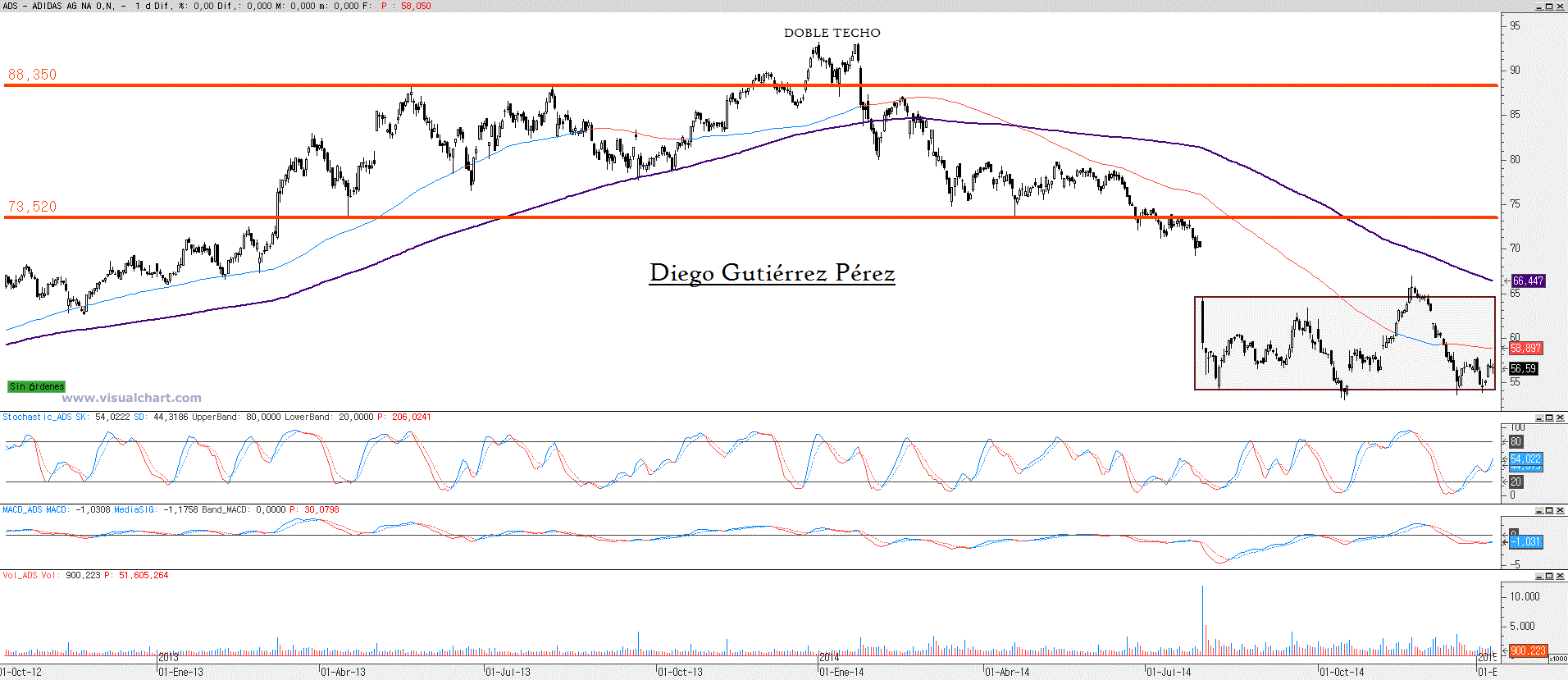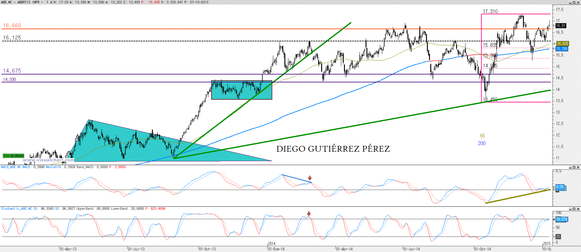 Sigue sin encontrar su rumbo, durante el 2.014 se movió lateralmente. Dejando patente una zona de resistencia entre los 16,12€ y los 16,66€ y una zona de soporte entre los 14,33€ y los 14,67€. Donde tanto alcistas como bajistas tuvieron su momento de gloria pero fugaz. Si a mediados de octubre los bajistas fracasaron en su ruptura, a principios de diciembre fue el turno de los alcistas que a pesar de un movimiento más sólido también acabo en una falsa ruptura. Sin embargo antes de despedirse marcaron un nuevo máximo histórico en los 17,315€. Cayendo hasta el 50% de retroceso de todo el impulso alcista comprendido entre octubre y diciembre. Nivel de Fibonacci en el cual los alcistas con un rebote ponían entre las cuerdas a los bajistas. Sin embargo los días han ido transcurriendo y la zona de resistencia sigue mostrándose como un lodazal, dificultando las pretensiones de los toros. Así de momento las espadas siguen en todo lo alto. Prueba de ello ha vuelto a ser la sesión de hoy 12 de enero, donde al cierre el precio nos dejaba una vela Doji, mostrando claramente la indecisión de los inversores / especuladores como ocurrió en las dos sesiones anteriores donde la formación de peonzas evidenciaba la debilidad de los alcistas. Así el rebote iniciado el 16 de diciembre no ha terminado de transformase en un nuevo impulso alcista, esto ocurriría siempre y cuando tuviéramos un cierre en gráfico diario por encima de los 17,315€. En este momento el nivel citado es de obligada vigilancia, junto con el hueco alcista del pasado 8 de enero. Estos dos niveles son claves en el corto plazo. Como decía anteriormente si el precio consigue superar los 17,315 sería un buen síntoma que nos abriría las puertas para entrar en este valor o aumentar nuestra posición. Por otro lado el cierre del hueco sería una señal de alarma pero para confirmar el cambio de rumbo a bajista sería importante aplicar como filtro la pérdida del soporte en los 16,125€ que como pueden constatar en el gráfico adjunto es muy fiable. Desde mi punto de vista en este momento no es recomendable comprar y aquellos especuladores más agresivos que se sientan a gusto en los movimiento laterales les recomendaría tener como referencia de su stop loss los citados 17,315€. Observando los osciladores podemos constatar que el macd a pesar de estar alcista sigue sin despegarse de la línea de tendencia dibujada en el gráfico, constatando la debilidad alcista anteriormente citada pero de conseguir animarse aún está lejos de los niveles de sobrecompra desde donde el precio ha necesitado respira mediante una corrección. El estocástico por su parte sigue también mostrando la misma debilidad que se evidencia en el macd al ser incapaz de superar el nivel 80, esto de producirse sería una señal de compra basándonos exclusivamente en este oscilador.