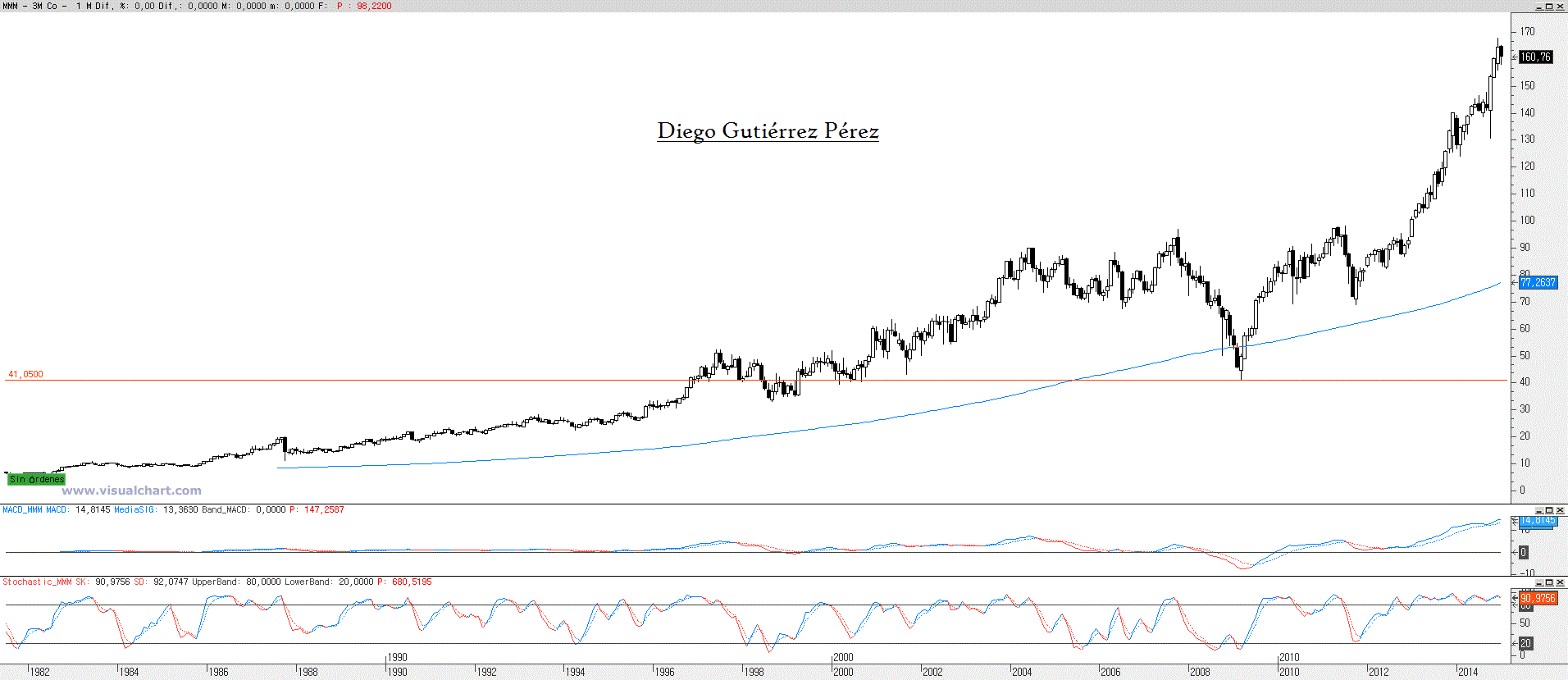 Aquí tenemos un valor del Dow Jones 30 con una extraordinaria tendencia alcista, tal como a simple vista se puede observar, fijándonos en la directriz alcista (línea verde). Si nos fijamos en el gráfico nº1 este nos muestra en un espacio temporal mensual el fuerte movimiento alcista. Podemos ver como en marzo del 2009, desde un mínimo en los 40,87$ se inicia el tramo alcista que en diciembre del 2.014 marcaba un nuevo máximo histórico en los 168,16$.