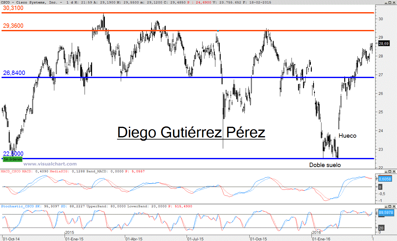 En octubre del 2015 fue el último intento alcista por doblegar la zona de resistencia, comprendida entre los 29,35$ y los 30,30$. E iniciándose a continuación una tormenta bajista, deteniéndose en un soporte clave en el año 2014, en el nivel de los 22,50$. A pesar de los reiterados intentos bajistas por romper el mencionado soporte no consiguieron su objetivo. Dejando un patrón de doble suelo, en su forma de Adam y Eva, como se le denomina en el mundo anglosajón. La activación del doble suelo se confirmó con un gran hueco de ruptura. Conduciendo las subidas, rápidamente hasta la resistencia de los 26,85$. Nivel que solo fue superado por los alcistas tras dos semanas de continuos ataques. Continuando las subidas y cerrando este pasado viernes en los 28,69$, marcando un nuevo máximo anual. La estructura alcista de corto plazo es impecable y desde que se inició el movimiento alcista no ha necesitado una corrección decente, muestra de gran fortaleza. No obstante, el precio se encuentra nuevamente ante la zona de resistencia de los 29,36$ y los 30,30$, donde las aspiraciones alcistas se transforman en una pesadilla. Así deberíamos estar muy atentos al hueco alcista del pasado 30 de marzo, por si este es de agotamiento. Lo aconsejable sería ceñir el stop loss al citado hueco, su anulación debería ser una señal para cerrar posiciones y así evitar pérdidas innecesarias ante un hipotético movimiento de corrección. Más que posible al encontrarse el precio en unos niveles bastante difíciles de batir, como se ha demostrado en el pasado. Y una corrección en una tendencia alcista es una oportunidad para entrar a unos precios más interesantes, entrar en este momento sería una osadía.
