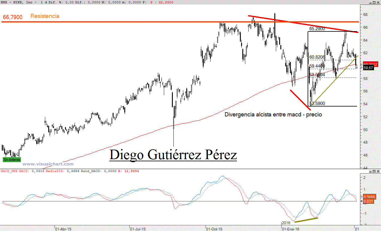 La tendencia alcista de corto plazo ha recibido en esta semana un duro revés. La estructura alcista iniciada a principios de febrero, confirmada por máximos y mínimos ascendentes en gráfico diario y semanal se detuvo a las puertas de la zona de resistencia de los 66$. Situación que se resolvió con una corrección pero esta no se ha frenado para iniciar un nuevo movimiento alcista que le lleva a atacar la zona de resistencia de los 66$ sino que por el contrario ha roto la directriz alcista de corto plazo con bastante violencia y llevándose por delante la media móvil de 200. En la sesión de ayer (martes) hubo una tregua entre alcistas y bajistas pero esta situación parece a todas luces una simple pausa tras el gran golpe bajista del lunes. El macd tiene señal de venta pero dentro de un movimiento alcista, sin embargo la pérdida en cierre diario por debajo de los 57,95$ sería una clarísima señal para cerrar posiciones. La pérdida de los 57,95$ significaría perder un mínimo ascendente y no solo eso sino perder el nivel del 61.8% de retroceso de Fibonacci una señal de gran debilidad alcista y que casi con toda probabilidad la despedida definitiva de la tendencia alcista de corto plazo y una más que probable visita a los 54$. Concluyendo, debería de vigilarse el nivel de los 57,95$, mientras permanezca a salvo perfecto si se pierde en cierre diario la mejor opción es cerrar posiciones.