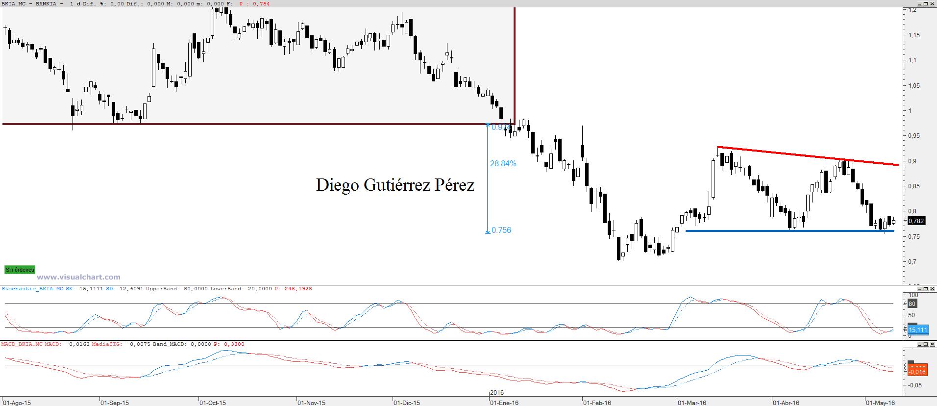 Se mantiene dentro un patrón chartista, conocido como triángulo descendente, esta formación es de continuación, como suele ocurrir en todos los triángulos. De momento, podemos ver claramente un soporte en los 0,762€ y una resistencia descendente que nos dibuja claramente un triángulo descendente. Esta situación nos ha dejado claro que los 0,90€ es el nivel donde los bajistas le muestran una señal de STOP a los alcistas e invitándoles a dar la vuelta, algo que los alcistas han respetado en dos ocasiones como podemos observar en el gráfico adjunto. En las últimas cinco sesiones el precio es incapaz de despegarse del soporte, situación para nada agradable para quien haya osado entrar largo, sobre todo sabiendo que BANKIA es bajista la miremos por donde la miremos. Un daytrader puede disfrutar de un movimiento tan perfecto como el que está desarrollándose en el triángulo descendente pero desde luego para un inversor no hay nada más desaconsejable que comprar este valor. La tendencia es nuestra amiga es uno de los principios sagrados del análisis técnico, no se puede ir contra las manos fuertes del mercado. Bien es cierto que el anterior tanteo al soporte los alcistas se vieron contra las cuerdas cuatro días hasta que al quinto día resucitaron como el ave Fenix hasta pegársela en los 0,9€. Con esto que quiero decir, que un especulador como un daytrader si podría ver una oportunidad en entrar largo (comprar) con un riesgo limitado y una rentabilidad de un 2:1 o 3:1 si la jugada le sale bien. Pero alguien que quiere comprar para dormir por las noches tranquilo y tras un tiempo de medio o largo plazo encontrarse con unas buenas plusvalías para nada le aconsejaría comprar este valor. En BANKIA son los bajistas quienes se están haciendo de oro y una ruptura del soporte del triángulo sería un nuevo pelotazo. Por tanto, si desea comprar hay muchos activos con mejores perspectivas tanto a nivel técnico como fundamental. Como consejo para Daytraders, la superación en cierre diario de los 0,80€ abriría las puertas hacia la resistencia del triángulo. Pero muy pendientes al soporte que al mínimo resquicio los osos entran en bandada.