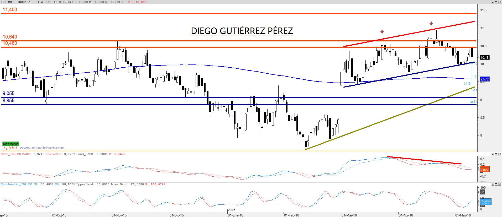 Continua moviéndose dentro de un canal alcista pero en las últimas sesiones los bajistas están atacando el soporte del canal. Esta situación se ve cada día más complicada al ser menor la distancia existente entre el soporte del canal y la zona de resistencia comprendida entre los 10,46€ y los 10,64€. Esta zona de resistencia ya ha demostrado anteriormente su fiabilidad. Durante los años 2013 y 2014 actuó como soporte y durante el segundo semestre del año 2015 hasta la fecha actual su rol ha sido como resistencia. Por tanto, es fácil de comprender los reiterados fallos alcistas que se han mostrado desde este pasado mes de marzo, en adelante. Esta situación puede terminar con una ruptura bajista del canal alcista, que le podría conducir a la zona de soporte entre los 8,85€ y los 9,05€, como objetivo teórico. La sesión de ayer mostro nuevamente la incapacidad de los alcistas al volver a darse la vuelta tras comenzar la sesión ante las puertas del nivel inferior de la resistencia, cayendo hasta el soporte del lateral pero finalmente se alejó lo suficiente como para que en la sesión de hoy miércoles no comenzará con la ruptura bajista del canal. De momento, el soporte del canal aguanta pero esta situación no puede permanecer eternamente mientras los bajistas sigan atacando de forma continuada. Y como decía anteriormente el margen de maniobra del precio cada día es más estrecho, esto va a provocar en breve una ruptura y de momento todo apunta que sea a favor de los bajistas. La media de 200 ya ha emprendido un movimiento ligeramente bajista, el macd se muestra bajista y acertó de pleno al dibujar una divergencia bajista, como pueden observar en el gráfico, el macd muestra una directriz bajista y el precio señalado por flechas muestra el movimiento alcista del precio, señal de divergencia que suele terminar a favor del oscilador, como fue este caso. El estocástico tiene señal de compra pero esto era por el movimiento alcista del viernes pasado y este lunes. Mi recomendación pasa por estar fuera de este valor y si estamos bajistas un cierre por debajo de los 9,913€ confirmaría el giro bajista ante una secuencia de máximos y mínimos descendentes y la visita a los 9€ estaría casi garantizada al confirmarse también la ruptura bajista del canal alcista. Mantenerse alcista tiene un primer problema y es la zona de resistencia tan reiteradamente comentada y en caso de ruptura su siguiente objetivo estaría en la resistencia del canal que ha demostrado su gran fiabilidad al ser tanteada hasta en tres ocasiones sin que los alcistas lograran romperla. Si no fuera por la zona de resistencia mi opinión sería distinta pero ustedes pueden comprobar mis temores observando el gráfico adjunto.