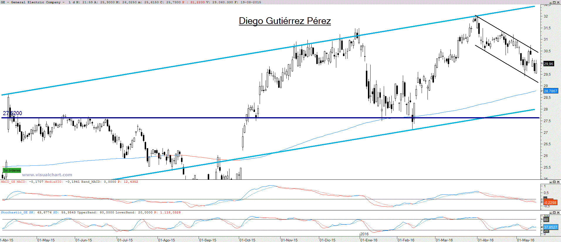 En el medio plazo se muestra alcista y consecuencia visible de ello es el movimiento de su precio en un canal alcista. El cual solo se mostró vulnerable en agosto del 2015 cuando su soporte cedió pero en octubre volvía adentrase en el canal para estrellarse con su resistencia a pesar de los ataques alcistas reiterados durante los meses de noviembre del 2015 a enero del 2016. Este gran fracaso de las hordas alcistas concluyó con una gran retirada hasta el soporte del canal alcista que esta vez sí se mostró fiable. Y siendo el punto de partida para un nuevo movimiento alcista hasta alcanzar nuevamente la resistencia del canal alcista, marcando el 31 de marzo un máximo anual en los 32,05$, pero nuevamente los descensos se reiniciaron. Esta vez las caídas se están desarrollando en un canal bajista. A pesar de esta situación, se puede apreciar en el gráfico adjunto que la zona comprendida entre los 29$ y los 29,55$ mantiene a los bajistas a raya. Sin embargo, hay que tener en cuenta que la estructura bajista desarrollada en el canal bajista muestra una secuencia de máximos y mínimos descendentes y mientras esta situación se mantenga el panorama de corto plazo se mantiene bajista. Ahora bien deberíamos céntranos en dos niveles de precios, el primero sería los 30,75$, la superación de este nivel marcaría un máximo ascendente que vendría precedido de la ruptura alcista de la resistencia del canal alcista y cuya consecuencia inmediata sería una vuelta hacia la resistencia del canal alcista de medio plazo. El segundo nivel a vigilar sería los 29,41$, un cierre por debajo de este nivel reanudaría la secuencia bajista y aumentaría las probabilidades de volver a tantear el soporte del canal alcista de medio plazo y solo haría falta ver antes de llegar a esta situación si la media móvil de 200 puede actuar de soporte dinámico. Concluyendo en el más estricto corto plazo el movimiento es claramente bajista pero sin olvidar que el movimiento de medio plazo es alcista y basándonos en la teoría esta situación de corto plazo debería ser aprovechada para entrar largos o aumentar nuestra posición alcista mientras no se pierdan los 27,10$, si ocurriera este hecho en gráfico semanal se anularía la secuencia de máximos y mínimos ascendentes y quizás estuviéramos ante un patrón harmónico de nombre tiburón alcista pero sin olvidar que aunque este patrón tiene connotaciones alcista se estaría desarrollando un movimiento bajista buscando un nivel C que sí sería un nivel de giro alcista que daría por finalizado el tramo bajista B-C, siempre basándonos en un hipotético patrón de tiburón alcista. Pero que nadie se alarme como dije anteriormente antes hay que perder el último mínimo ascendente en gráfico semanal, en los 27,10$. Ahora mismo hay que centrarse en los niveles de precio mencionados los 30,75$ y los 29,41$. Siempre paso a paso aunque hay que intentar prever el peor escenario. No hay que olvidar que General Electric está muy lejos de su máximo histórico en los 60€, allá por el año 2000 y aún lejano los 42$ máximo en el año 2007. Los más avistados se habrán dado cuenta que estos máximos y descendentes corresponden a los dos grandes cracs bursátiles en lo que llevamos de siglo, seguramente no serán los últimos.