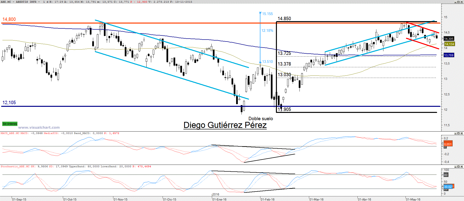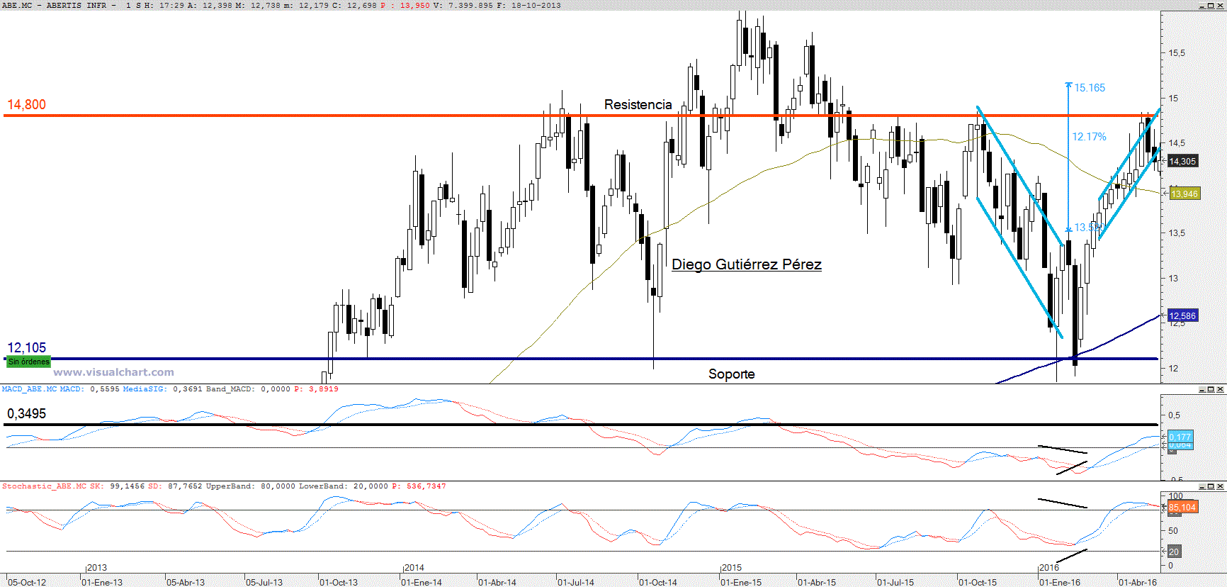 Entre enero y febrero de este año se formó un doble suelo partiendo desde el soporte del lateral, con un objetivo teórico en los 15,165€. Tras un arranque apoyado por diversos huecos alcistas confirmaba el patrón de doble suelo pero poco tiempo después tropezaba con la media móvil que actuaba como resistencia dinámica. Consiguiendo tras varios intentos doblegarla a alza para moverse en un canal alcista que le condujo hasta la temible resistencia de los 14,80€, asaltado las dudas en las filas alcistas y a consecuencia de ello estamos ante una corrección muy contralada, dentro de un canal bajista. Observando el gráfico diario el oscilador macd nos muestra señal de venta pero por encima del nivel 0 esto quiere decir que solo estamos ante una corrección permaneciendo estable la tendencia alcista de corto plazo. En el gráfico semanal su señal es claramente de compra, apoyando la tendencia alcista dentro de un lateral. El precio por su parte ha fracasado en las últimas tres sesiones por doblegar la resistencia del canal bajista sin éxito, situación que podría volver a conducir al precio hacia la zona de soporte del canal bajista. Así que realmente estamos viendo un ataque continuado por parte de los alcistas de superar a alza el nivel inferior de la zona de resistencia, es decir los 14,5€. Esta situación tiene dos caminos. El primero los alcistas superan los 14,5€ para atacar los 14,80€ última línea defensiva que dejaría camino hacia los 16€ o el segundo de los caminos veremos cómo continúa la corrección. En principio el nivel entre los 13,70€ y los 13,76 es la primera zona posible de giro, coincidiendo con el 38.3% de Fibonacci de todo el impulso alcista iniciado el pasado 12 de febrero. Terminando con mi exposición no descarto la continuidad de la corrección pero sin olvidar que la tendencia alcista todavía es fuerte, simplemente estamos viendo que el precio se estrella una y otra vez con la zona de resistencia comprendida entre los 14,50€ y los 14,80€. Además el movimiento bajista canalizado muestra que los bajistas no tiene al menos hoy por hoy la fuerza suficiente como para conducir las caídas de forma brusca, habitual en los osos, hasta la zona de soporte del lateral en el que está inmerso en el largo plazo.