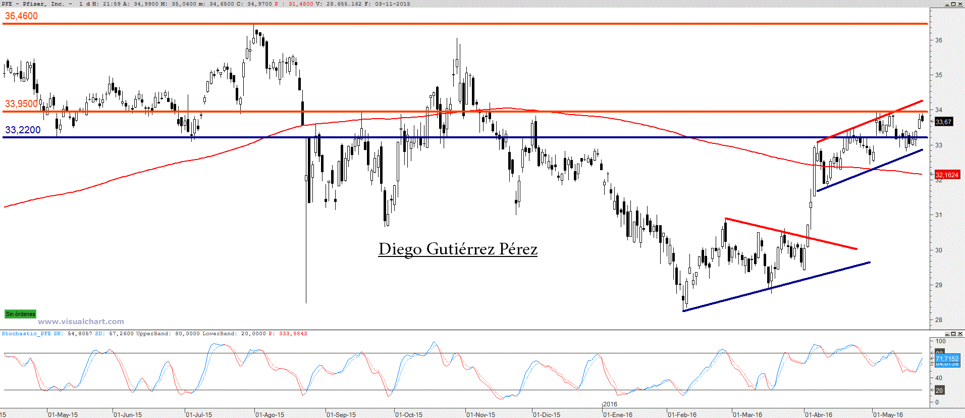 Se mantiene alcista en el corto plazo, desarrollando desde comienzos de abril un movimiento dentro de un canal alcista. Pero frenando su movimiento la resistencia de los 34$, hechos que vuelve a confirmarse en las dos últimas sesiones. Esta circunstancia impide al menos de momento avanzar hacia la resistencia del canal alcista y más importante aún la ruptura de los 34$ abriría las puertas para avanzar hacia los 36$. Una vuelta al soporte del canal no se puede descartar y tampoco debería extrañar. Circunstancia que para nada anularía la tendencia alcista de corto plazo y mucho menos la tendencia alcista de largo plazo. Observando un gráfico mensual no incluido en este artículo es muy llamativo ver como la media móvil de 200 actúa perfectamente como un soporte dinámico, hecho que ha demostrado en numerosas ocasiones, desde luego muy llamativo. En resumen un valor alcista y el cual debemos tener en cuenta bien para entrar o para aumentar posición, eso sí, es preferible comprar en las correcciones. Para nada recomendable abrir posiciones largas en este momento, mientras ataca zona de resistencia.