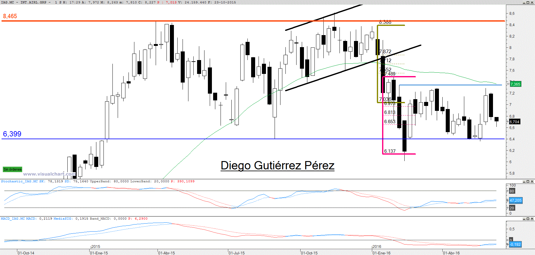Se mantiene sin cambios en el corto plazo, movimiento lateral entre los 6,40€ (soporte) y los 7,34€ (resistencia). Los alcistas no tiene problemas para alcanzar los 7€, sin embargo los problemas aparecen en los 7,20€, donde los bajistas esperan cómodamente, dejando a los alcistas avanzar tranquilamente y confiados para después hacerles salir huyendo hacia su refugio en los 6,40€. Los osciladores macd y estocástico se mantiene casi planos. En este punto solo cabe dos opciones, la primera es mantenerse fuera, no solo en el corto plazo IAG esta lateral sino que además en el medio plazo está en la misma situación, en un rango comprendido entre los 6,40€ y los 8,46€. La segunda opción sería una estrategia tendencial de largo plazo y para ello abriríamos largos en el soporte de corto y medio plazo, es decir los 6,40€ y un stop loss en cierre diario por debajo de los 6€.