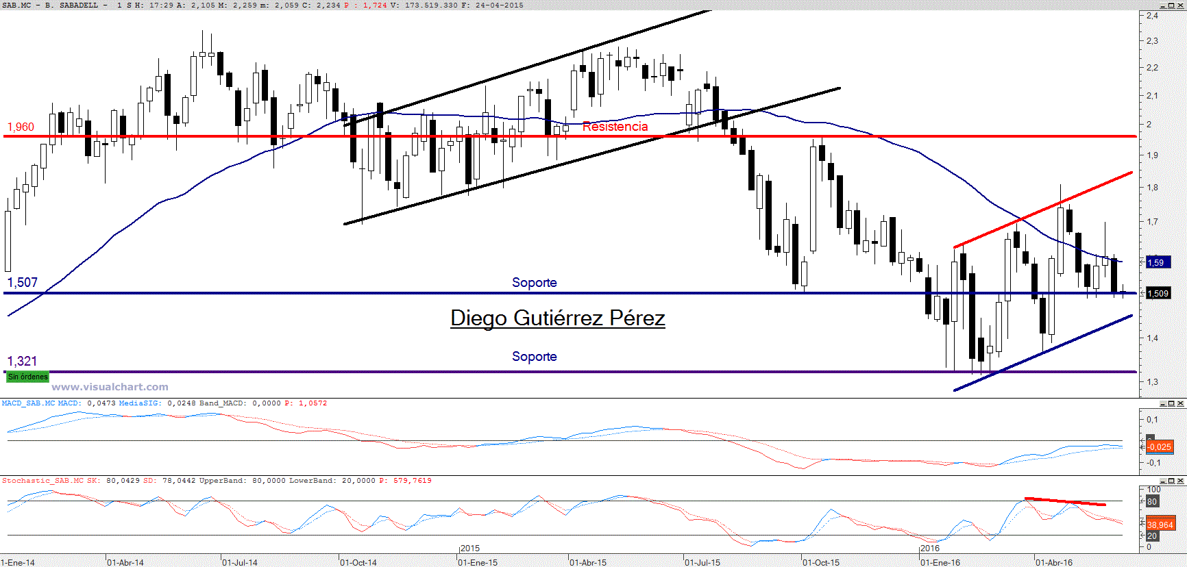 Continúa en el corto plazo inmerso en un canal alcista. A finales de abril terminaba el último ataque a la resistencia del canal. Dando lugar a un nuevo movimiento bajista que le condujo hasta el soporte de los 1,50€, nivel de precio que se ha convertido en el reducto de los alcistas. Frenando “victoriosamente” los ataques por romper este soporte. Sin embargo el último cierre semanal irrumpía con fuerza, cerrando muy ligeramente por debajo del soporte. Pero este lunes los bajistas desperdiciaban su ventaja, cerrando la sesión en los 1,509€. A pesar de este fallido intento la situación es crítica. Si no hay reacción alcista no me cabe duda que la visita al soporte del canal alcista está casi garantizada, en este momento se encuentra sobre los 1,45€. Los osciladores son claros el estocástico mantiene señal de venta y el macd está a punto de ofrecer idéntica señal, e informándonos que el escenario principal es bajista y solo estamos ante un rebote de corto plazo y cuyo movimiento como les comentaba está oscilando en un patrón de canal alcista. La pérdida de los 1,494€ confirmaría la secuencia de giro bajista al tener dos máximos y dos mínimos descendentes. Hecho que permitiría a los bajistas situar su stop loss por encima de los 1,70€. No obstante, sería muy importante que la perdida de los 1,70€ fuera en cierre semanal para reducir la posibilidad de una falsa señal. Pues aunque ceda el soporte de los 1,50€ el soporte del canal está muy próximo y podría frenar el movimiento bajista.