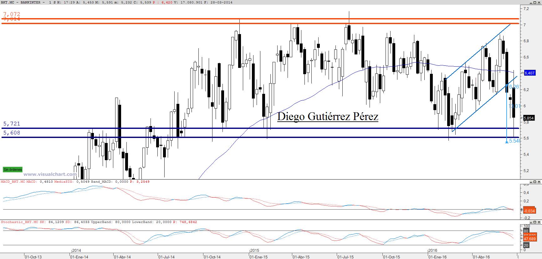 Su situación de medio/largo plazo se mantiene intacta en un movimiento lateral, comprendido entre los 5,60€ - 5,72€, como zona de soporte y los 7€ - 7,07€, como zona de resistencia. A lo largo de este año el precio comenzó a desarrollar un movimiento alcista desde zona de soporte del lateral. Este movimiento se encontraba inmerso dentro de un canal alcista que le llevo hasta los 6,80€, donde los problemas volvieron a resurgir y es que si comprueban el gráfico semanal adjunto pueden observar como desde julio del 2015 los ascensos se han frenado en la zona de los 6,80€ - 6,88€, dando paso a los bajistas para conducir el precio hacia la zona de soporte del lateral. Así a principios de junio volvía a desaparecer la posibilidad de alcanzar los 7€. Los bajistas tomaron el testigo y con la fuerza habitual que los caracteriza a mediados de junio rompían el soporte del canal alcista, marcando un objetivo teórico en los 5,54€. Durante la semana pasada y coincidiendo que teníamos en el punto de mira el referéndum del Brexit de forma bastante ilógica los alcistas volvieron a tomar el timón en una semana a todas luces para salir corriendo pero en la sesión del viernes tras conocerse el resultado del mencionado referéndum el precio se desplomaba, frenándose las caídas en la zona de soporte del lateral que tan bien se ha comportado desde octubre del 2014 deshaciendo todas las aspiraciones bajistas, al menos de momento. La reacción desde la zona de soporte de los alcistas fue formidable alejando la amenaza y mostrando a los bajistas que deberán esforzarse muchísimo más si quieren romper la zona de soporte. Ante esta situación hay que estar en guardia pues los ataques bajistas difícilmente van a desaparecer y tenemos que tener en cuenta que el objetivo por ruptura del canal alcista está en los 5,54€ y en la sesión del viernes se quedó a solo a 7 céntimos. La ruptura del lateral agravaría enormemente la situación y tendríamos un objetivo teórico en los 4,20€. Pero como siempre digo hay que ir paso a paso, de momento la zona de soporte (5,60€-5,72€) ha aguantado y mientras no veamos un cierre semanal por debajo de los 5,60€ no habría que salir huyendo, aunque desde el punto de vista del análisis técnico siempre se aconseja estar fuera de movimientos laterales. Para quienes están bajistas deberían mantener su stop loss ligeramente por encima de los 6,88€ en cierre diario. Y en el caso de ruptura del lateral bajar el stop loss a los 6,44€ en cierre diario, pero solo si el precio rompe el lateral. Los osciladores macd y estocástico se han puesto de acuerdo y marcan señal de venta, aunque el macd necesita que su señal media confirme la caída por del bajo de la línea 0, solo le falta un suspiro para confirmar el escenario bajista.