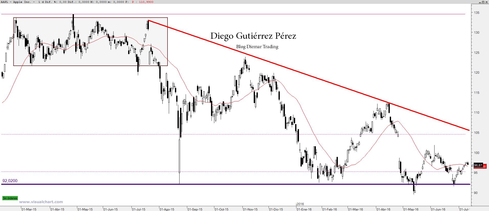 Curiosidades de la vida ayer mismo volví a ver un documental sobre Steve Jobs y hoy tengo entre manos analizar la que fue su empresa y es que en mi caso no suelo buscar valores en concreto sino que dejo que un programa de números aleatorios decida por cual valor decantarme. En fin entrando de lleno en materia este es un valor que tengo en mi cartera de renta variable a un precio de 94,23$ la acción y en la cual tengo depositadas grandes esperanzas en el medio y largo plazo. Bien es cierto que lejos está de los 134,54$ que alcanzó el 28 de abril del 2015 (máximo histórico) pero eso no quita que Apple sea un valor con un fondo claramente alcista. En el segundo trimestre del 2015 el precio hizo techo en forma de rectángulo un patrón de continuación habitualmente pero en esta ocasión el precio decidió que era el momento de una corrección. Una oportunidad fenomenal para entrar largo (comprar) en lo que se conoce como “buy on dips” o traducido al castellano “compra en las caídas”. El precio descendió hasta los 92$ y este nivel de precio desde entonces ha actuado como nivel de soporte. Poniéndose a prueba en numerosas ocasiones a lo largo del 2016 y aunque en alguna vela diaria o semanal el precio ha conseguido cerrar por debajo de los 92$ curiosamente no se ha dado la misma circunstancia en gráfico mensual. Esto deja patente la importancia de este nivel de precio y es el que debemos de vigilar, debido a la proximidad del precio en la actualidad. Sin embargo les recuerdo que en gráfico mensual el precio no ha cerrado por debajo de los 92$, esto hay que tenerlo muy en cuenta antes de salir corriendo si la situación empeorara. Desde un gráfico mensual la perspectiva es muy clara estamos en una onda 4 que es correctiva pero nos falta una onda 5 impulsiva alcista, siempre basándonos en la teoría de Elliot y como he dicho en un gráfico mensual. En gráfico diario tenemos un nivel de soporte en los 92$ y una directriz bajista, compuesta por máximos descendentes, esto en chartismo se le conoce como triángulo descendente y es un patrón de continuación. No obstante, hay que decir que el rebote iniciado en mayo debería de haber roto la resistencia del triángulo descendente, algo que no ha ocurrido y es que el hueco bajista del pasado 27 de abril ha puesto a los alcistas contra las cuerdas. En este momento estamos ante un nuevo rebote pero sin fuerza y cada vez más cerca del vértice del triángulo algo que para nada es bueno pues en dichas circunstancias el precio se puede mover como un caballo desbocado y puede ser tan nefasto para alcistas como para bajistas, aunque para estos la situación de medio plazo sigue pintando bien con el único inconveniente del soporte de los 92$ que se mantiene muy firme a pesar de los constantes ataques bajistas pero como dice cierto dicho “el cántaro que mucho va a la fuente acaba rompiéndose”. En resumidas cuentas ponerse a estas alturas bajista no tiene mucha lógica pues como dice otro dicho “el pescado está vendido” y solo la ruptura del soporte de los 92$ podría ser una nueva oportunidad para entrar cortos (vender) pero si lo estamos deberíamos cerrar posición inmediatamente si el precio cierra en gráfico diario por encima de los 104,35$. Si estamos largos (comprar) yo no cerraría posición mientras el precio en gráfico mensual no cerrara por debajo de los 92$, esto sería una malísima noticia para los que hemos entrado largos (comprar). Pero cuidado apliquemos en ese caso un filtro por ejemplo el del 3%, es decir si el precio cierra un 3% por debajo de los 92$ hay que cerrar posición sí o sí. Aquí nada de hacerse falsas esperanzas, nos hemos equivocado y punto, tiempo habrá de lamerse las heridas y ajustar cuentas. La esperanza solo es para los perdedores nunca lo olvidéis. La esperanza es el cáncer más peligroso al que se enfrenta un especulador o inversor. La esperanza o la Fe la dejamos en la iglesia, en la sinagoga o en la mezquita, en los mercados somos ateos.