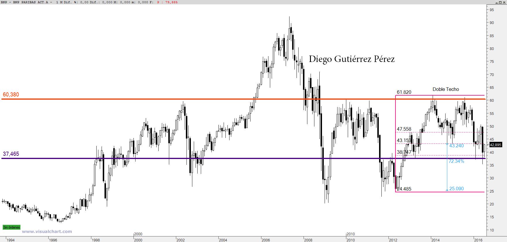 En el más estricto corto plazo lo está haciendo muy bien y prueba de ello es que en gráfico diario tenemos una secuencia de máximos y mínimos ascendentes. El gran problema radica en el enorme hueco bajista del pasado 24 de junio. Mientras este hueco siga vigente el fantasma bajista no habrá desaparecido y es que no debemos olvidar que la tendencia de medio plazo es bajista y en gráfico mensual tenemos un doble techo, confirmado y con objetivo teórico en los 25,09€, es decir volveríamos a los mínimos del 2012. El actual movimiento alcista de corto plazo se inició en el soporte de los 37,47€, en este 2016 ya tuvimos anteriormente una visita a dicho nivel, desde donde los alcistas iniciaron un rebote (febrero) y cuyo final vino de la mano del referéndum del Brexit. Así que debemos de vigilar el soporte de los 37,45€ pero en gráfico semanal, es en este espacio temporal es donde se puede apreciar perfectamente los fracasos de los bajistas ante este soporte, visibles también en gráfico mensual. Así que en el corto plazo tenemos que estar pendientes tanto del hueco bajista, como del soporte de los 37,47€. Como decía anteriormente los alcistas deben anular el hueco bajista y para ello es necesario un cierre diario por encima de los 47,70€, aún hay mucho camino por andar y sin olvidar que el precio estaría inmerso en una onda 3 impulsiva, basándonos en la teoría de Elliot y veo muy difícil que la citada onda pueda anular el hueco bajista y una vez desarrollada la onda 3 le sigue una onda 4 correctiva. Así que hay que ser cautelosos y tener presente si operamos en el corto plazo un plan de salida. Para mi punto de vista este no es un valor para inversores de medio o largo plazo, exceptuando especuladores. Si estamos bajistas la salida de este valor es clarísima la anulación del hueco bajista será la señal para cerrar posiciones sin titubeos. La anulación de un hueco bajista y más la de estas proporciones conlleva la entrada de una horda de alcistas sedientos por conducir el precio hacia la inexpugnable resistencia de los 60€, infranqueable desde el 2010. En resumen BNP en el corto plazo es sin duda un valor alcista pero solo apto para inversores o especuladores de corto plazo, en gráfico semanal no tenemos señal de giro alcista y por ende no es un valor para entrar con miras al medio, largo plazo. En gráfico mensual tenemos un doble techo aunque un cierre semanal por encima de los 50€ espantaría a la mayoría de posiciones bajistas abiertas apoyándose en este patrón chartista y solo restarían los que aun confiaran en la invulnerabilidad de la resistencia de los 60€.
