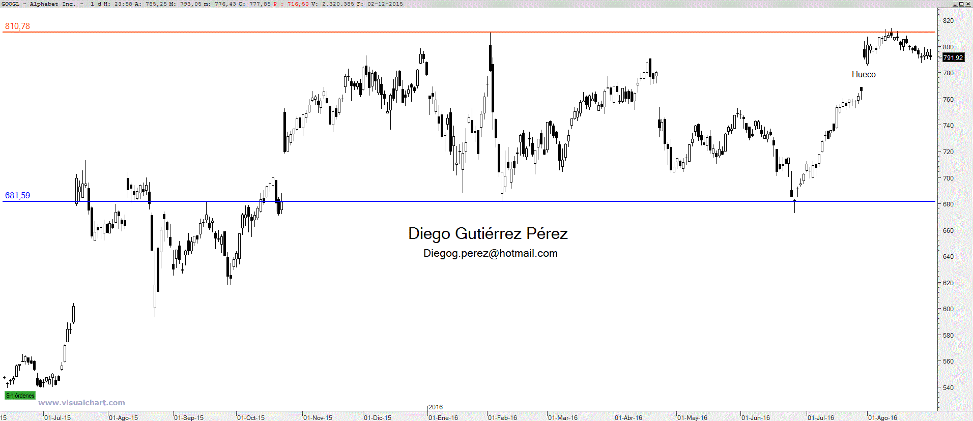 A grandes rasgos podemos afirmar que Alphabet se encuentra inmerso en un movimiento lateral en lo que llevamos de 2.016, comprendido en un rango de precios entre los 682$ (soporte) y los 810,35$ (resistencia). En el más estricto corto plazo hay que vigilar el hueco alcista del pasado 29 de julio, su importancia radica en que siguiendo las enseñanzas del análisis técnico muchas posiciones alcistas cerrarían posición si los bajistas consiguieran anular dicho hueco, para ello sería necesario un cierre diario por debajo de los 765,84$. De suceder este hecho el cierre de posiciones alcistas conllevaría a dejar las puertas abiertas para dirigirse hacia el soporte del lateral. Por tanto hay que estar muy pendientes del citado hueco si estamos largos, mientras este permanezca sin ser anulado mi recomendación es mantener posiciones. No obstante, una vuelta al nivel del soporte no estaría mal para entrar largo pero hoy por hoy esa posibilidad tiene poco peso mientras como he dicho ya anteriormente el hueco alcista no sea anulado. Pero soy de los que piensa que hay que entrar en las correcciones de un valor alcista como es este caso y que los anglosajones llaman “buy on dips”.