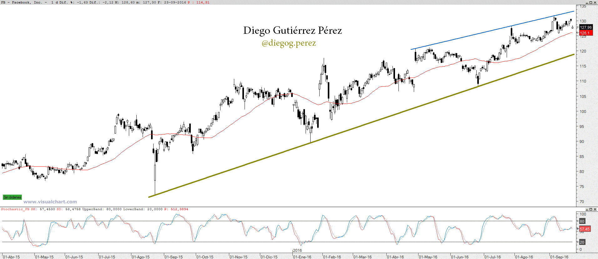 Facebook es hoy por hoy una de las locomotoras junto a Amazon responsables de llevar al Nasdaq 100 a máximos históricos. La empresa de Mark Zuckerberg dueña también de empresas como Instagram, WhatsApp y la reciente red social para adolescentes Lifestage no conoce límites, este mismo mes marcaba un nuevo máximo histórico en los 131,98$. Cerrando en la sesión del 23 de septiembre en los 127,96$ durante la cual terminó con una caída de algo más del 2% en una jornada negativa para la renta variable a nivel global. No obstante en este año el precio de su acción se ha revalorizado un 36,17%, toda una proeza y aún más cuando miramos al pasado y podemos ver como en el 2013 alcanzaba un mínimo anual en los 22,67$ lo que supone que a cierre del 23 de septiembre la acción ha subido un 464,44% y esto en menos de 4 años. Este dato importantísimo no deja dudas de que estamos ante un valor alcista se mire como se mire y por tanto un valor a tener en cartera, desde mi punto de vista y como así lo dicen la mayor parte de los analistas, marcando un objetivo en los 155$, sin olvidarnos de las firmas de investigación cuyas recomendaciones oscilan entre compra fuerte y compra. Desde el punto de vista del análisis técnico es un valor a tener en cartera, como decía anteriormente estamos ante un valor netamente alcista aunque desde mi punto de vista siempre es preferible entrar en este tipo de valores cuando se encuentra en una corrección o como dicen los anglosajones “buy on dips”. Ciertamente Facebook lleva algo más de dos meses sin corregir y mirando el gráfico adjunto toca ya un respiro para los alcistas y permitir la entrada de nuevos participantes, una visita a la directriz alcista de medio plazo no estaría mal, esta como pueden observar en el gráfico se ha mostrado bastante fiable. Una vuelta a los 120$ no estaría nada mal aunque Facebook se puede permitir el lujo de una corrección de mayor magnitud y no por ello dejaría de ser un valor netamente alcista. En el más estricto corto plazo deberíamos de vigilar el hueco bajista de la sesión del viernes, ya que mientras este no sea anulado la posibilidad de una corrección será más que evidente y como he dicho anteriormente una gran oportunidad para entrar (comprar) o aumentar nuestra posición. Obviamente la anulación del hueco bajista que pasaría por un cierre por encima de los 130,04$ le llevaría nuevamente a máximos y para nada sería de extrañar ver como marca un nuevo máximo histórico. Pero como digo en el más estricto corto plazo hay que estar muy pendiente de la evolución del precio, un cierre diario por debajo de los 125,75$ confirmaría una señal de giro bajista pero eso solo quiere decir que la corrección está en marcha, nada de cambio de tendencia. Con esto no quiero decir que hay que comenzar a vender, eso queda totalmente prohibido y sobre todo para inversores de medio y largo plazo. Quienes han entrado en máximos sí que tendrían problemas pero eso solo ocurre por lo que denomino un fallo de precipitación y no esperar una corrección pero como también dice el dicho “quien no arriesga no gana”.