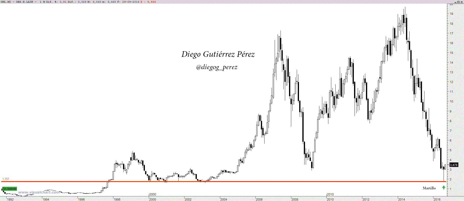 Vive los peores momentos de su trayectoria bursátil, en junio del 2014 alcanzaría su máximo histórico en los 19,716€. Sin embargo esto sería el punto de inflexión para caer a las tinieblas y dos años después de su descenso a los infiernos sigue sin encontrar el camino hacia luz. Este pasado agosto marcaría un mínimo anual en los 1,731€, situación que nos hace retroceder en el tiempo hasta el año 2.003, por debajo incluso de los mínimos que azotaron a este valor tras la crisis conjunta del sector financiero e inmobiliario. La inmensa reducción de beneficios, la caída en picado de los bonos y cuya puntilla la puso Moody’s tras rebajar su rating a lo cual hay que agregar la reducción de participación de Villar Mir hacen de este valor una bomba de relojería, solo apto para inversores o traders en plan kamikaze. En el más estricto corto plazo en agosto nos dejó en gráfico mensual una pauta candlestick de giro alcista conocido como “martillo” y que de momento ha paralizado la sangría pero no hay que olvidar que en este año ha caído un 32,16% y se encuentra un 44,45% por debajo del máximo marcado este año en los 6,261€ donde se formó un doble techo. Lo que podemos constatar en gráfico mensual es la incapacidad de los bajistas de cerrar por debajo de los 3€, detalle a tener en cuenta para aquellos que han osado entrar largos en un valor bajista se mire por donde se mire. Si alguien se atrevió a entrar largo apoyándose en la pauta mensual de martillo (adjunto se presenta el gráfico en escala mensual) deberían cerrar posición si el precio cierra por debajo de los 1,731€ pero no lo olviden el cierre debe ser mensual, no vale un cierre semanal o diario. Confiar en OHL es más que una cuestión de Fe y ni la Virgen de la Macarena por la que siente devoción la ministra en funciones Fátima Báñez y a la cual se encomendó para que creara empleo en España podría salvar a este valor de su San Benito. Lo único positivo y que hubiera sido la puntillita llego desde México tras la noticia de la auditoria del estado de México que concluyo que la filial OHL México actuó legalmente en concordancia con otras auditorías externas. Siendo bien recibido esta noticia por los inversores y plasmado en el actual rebote. Todo no podía ser malas noticias. Si estamos fuera mejor continuar así y no caer en la tentación pues como dijo Peter Lynch “que a una empresa le vaya mal no significa que no le pueda ir peor”.