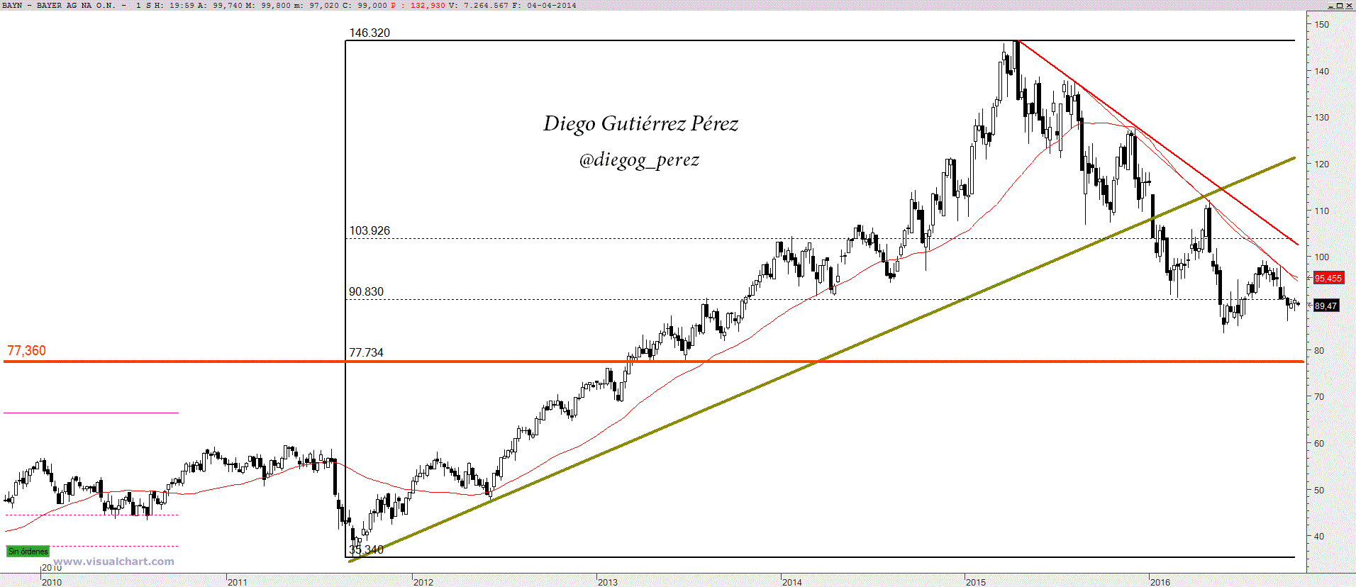 Esto representaba que entre el mínimo del 2011 y el máximo del 2015 el precio de la acción se había revalorizado en un 314,17% en menos de 4 años. Pero como todo lo que sube baja la devaluación del yuan chino arrastró al abismo a toda la renta variable a nivel global y por tanto Bayer también siguió igual destino. Sin embargo, este 2.016 tampoco le está sentado bien y en lo que lleva de año la acción ha sufrido una depreciación del 24,11%. El escenario de medio y corto plazo es bajista a pesar del rebote iniciado en mayo que se desvaneció ante las puertas de los 100€, dando lugar a una nueva oleada de ventas.
