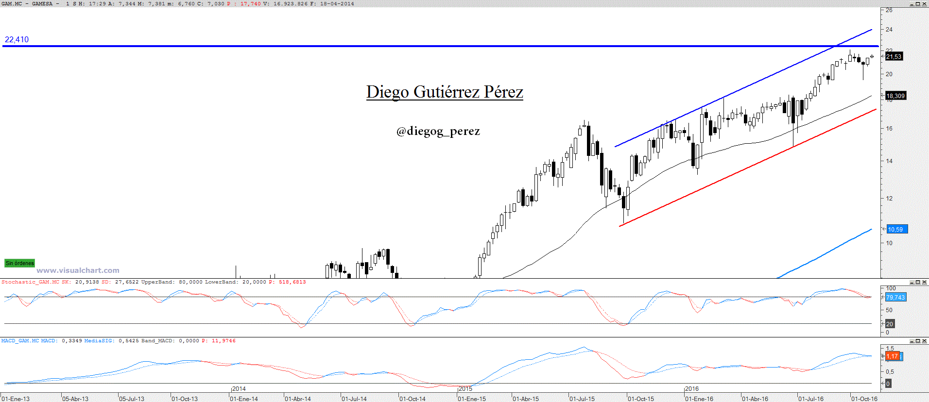 Pero esta posibilidad, si finalmente se produce va a ser una bendición para quienes quieren incorporar a su cartera este fabuloso valor. Una vuelta al soporte del canal que se encuentra sobre los 17,30€ sería una buena oportunidad para comprar. No hay que olvidar que Gamesa es alcista en el largo y medio plazo y en el corto plazo podríamos hablar de un movimiento de consolidación. Basándonos en el análisis técnico hay que aprovechar las correcciones para entrar a favor de la tendencia de medio plazo y como he dicho anteriormente es alcista.