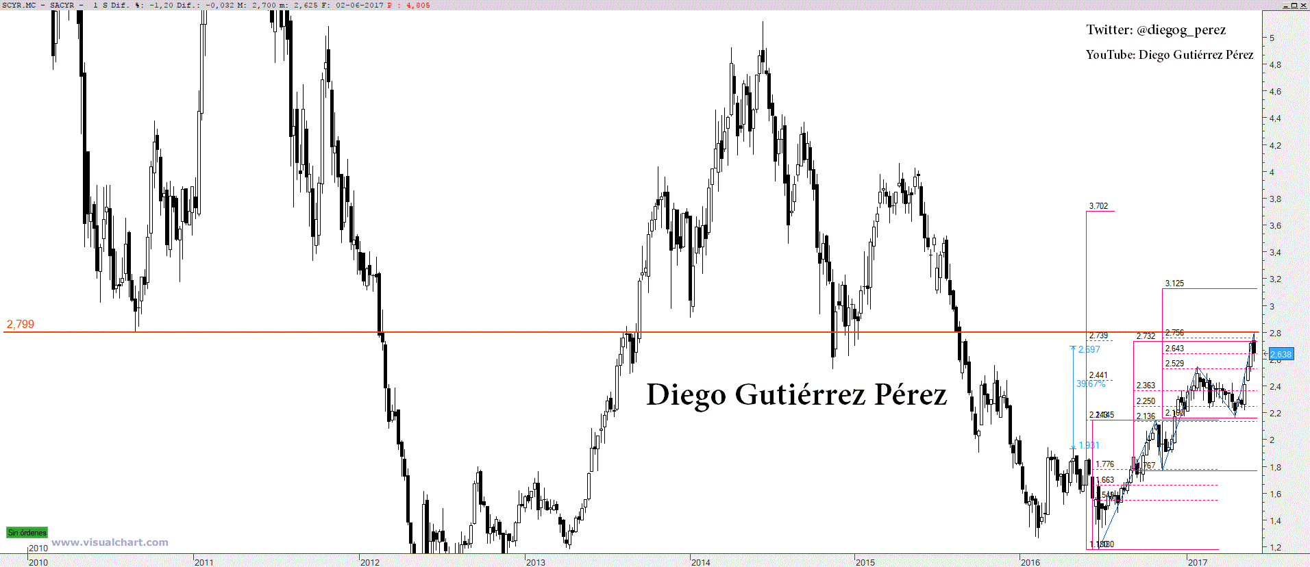 La formación de un doble suelo entre mayo y julio del 2.012 catapulto a Sacyr hasta los 5,117€ por acción, máximo del 2.014. Volviendo a ser presa de los despiadados bajistas y aunque los alcistas les plantaron cara los descensos se impusieron hasta alcanzar los 1,174€ mínimo anual del 2.016. Nuevamente los alcistas habían formado con muchísimo esfuerzo un doble suelo entre los meses de febrero y junio de ese mismo año. Solo restaba una confirmación para dar alas a los alcistas y dejar atrás la posibilidad de que solo estuvieran asistiendo a un simple rebote. Confirmación que llegaría en la primera semana de octubre y que dejaba un objetivo teórico por confirmación de doble suelo en los 2,70€.