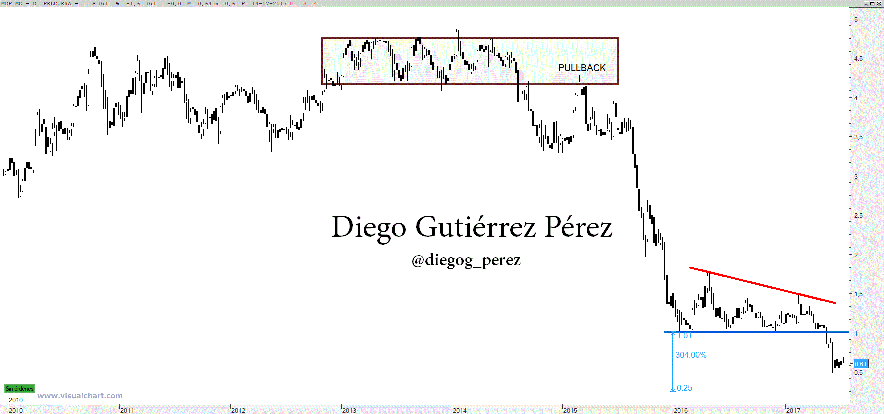 No obstante, hay que centrarse en el presente. En el más estricto corto plazo está consolidando entre los 0,55€ - 0,70€ pero como decía con muchos problemas para doblegar los 0,60€. Los alcistas se la juegan a una carta, perder los 0,55€ les conduciría a caer hasta 0,40€. No olvidemos que esta consolidando, es decir se está moviendo en lateral y el rango (altura) son 0,15€ y este sería la proyección teórica. Lo que nos pondría a tiro los 0,25€ objetivo teórico por ruptura del triángulo descendente, al estar nuevamente en caída libre.