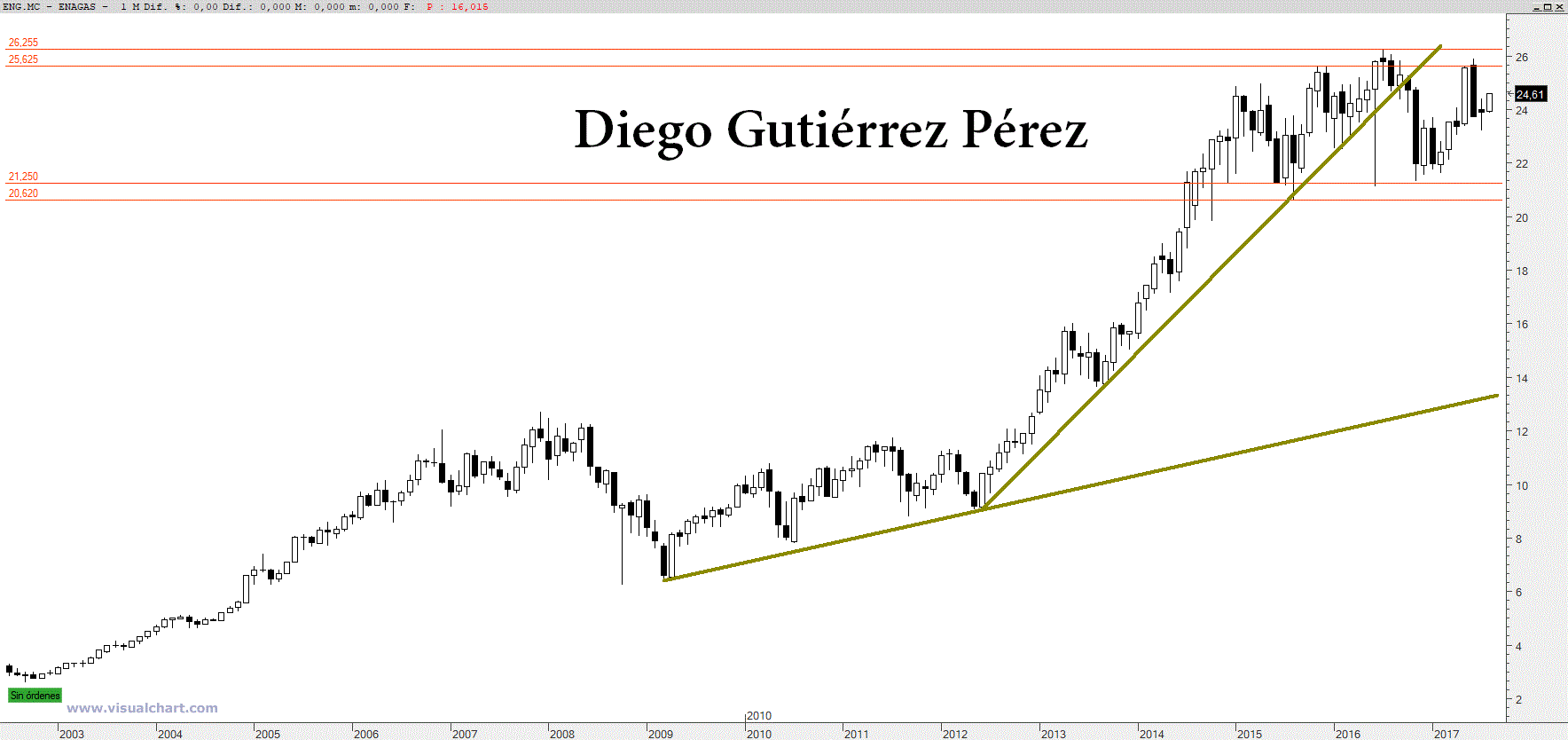 Enagas Lleva desde el 2015 moviéndose en un movimiento lateral, cuyo zona de soporte oscila entre los 20,63€ - 21,24€ y la zona de resistencia entre los 25,64€ - 26,26€ (máximo histórico). Muy atrás queda la pauta mensual de martillo (el amigo Oliver Velez le llamaría gran elefante blanco), plasmada en octubre del 2008 y que puso punto final a la tendencia bajista iniciada en 2007. El mínimo del martillo mencionado en los 6,246€ fue el mínimo anual en aquel 2008 y respetado a pesar de que a principios del 2009 los bajistas estuvieron a punto de dar el susto al marcar un mínimo anual en los 6,418€. Pero la respuesta a ese minino en el mes de marzo fue la formación de una envolvente alcista que anularía a los bajistas y que sería el pistoletazo de salida para una tendencia alcista en gestación y cuya confirmación no llegaría hasta diciembre del 2012.