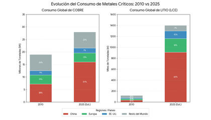 Evolución del consumo de cobre y litio por países de 2010 a 2025