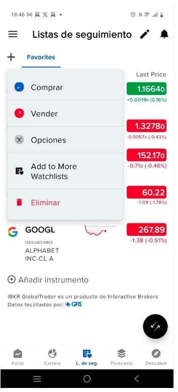 Seguimiento de cartera, gráficos interactivos, alertas de precios, operaciones con un toque, y acceso a noticias y datos fundamentales. Menos técnica que TWS o IBKR Mobile.