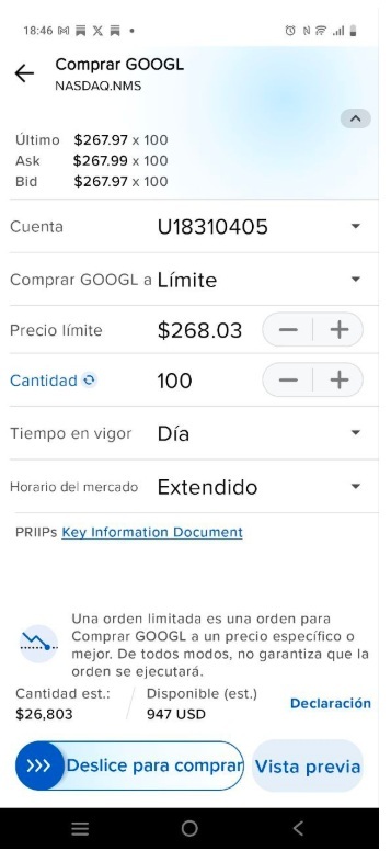 Paso 3: Y finalmente, tan solo tienes que fijar la orden de compra de forma muy sencilla, como en la app de cualquier otro broker. Fíjate en cómo lo he hecho yo:
