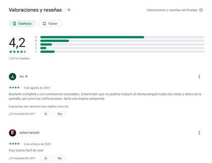 Como podemos observar, en el foro Google Play Store (que permite la valoración y reviews de la comunidad), cuenta con 4,2 estrellas (sobre 5), para algo más de 1.500 reseñas. Una nota bastante elevada, sobre la que las opiniones de los usuarios ponen en valor la sencillez, a la par que amplitud que permite la plataforma.