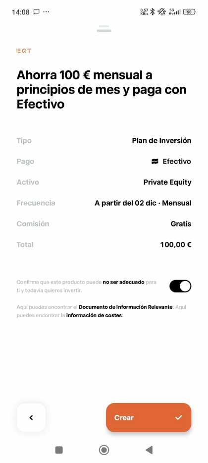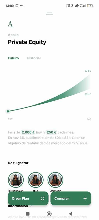 Ya en la app verás la sección Private Market, ahí aparecen los dos vehículos de inversión (Apollo y EQT) con toda su información básica. Tan fácil como elegir cuál de los dos fondos quieres. En ambos casos, la inversión mínima es de 1 euro, las comisiones de gestión y de éxito también, así como el objetivo de rentabilidad (no garantizado).
