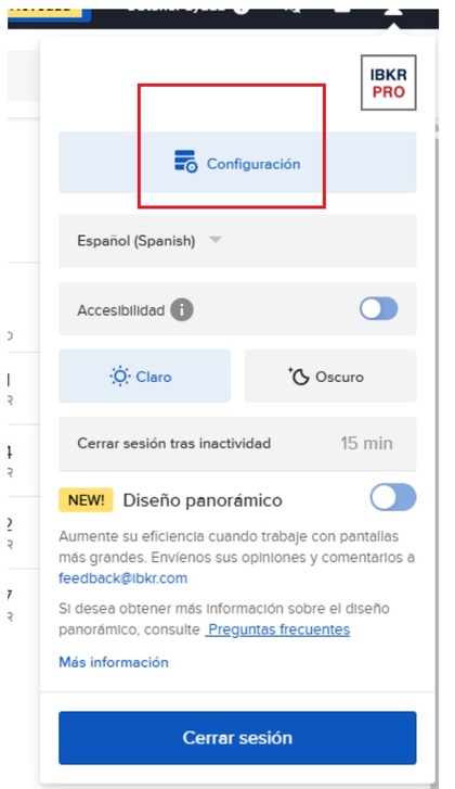 Una vez ya tienes abierta tu cuenta en IBKR, solo debes de iniciar sesión en el broker, y dentro del perfil de usuario, ir a la opción de “Configuración”.