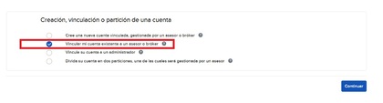 Y ahora sí, debes indicarle a IBKR exactamente lo que vas a hacer, es decir, “Vincular mi cuenta existente a un asesor o broker”.