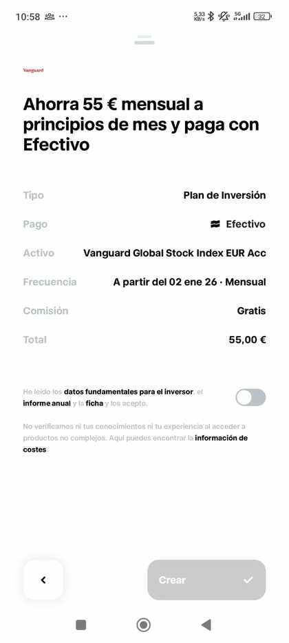 Elige el importe que quieres invertir y confirma la orden de compra desde la app. Ten en cuenta que, en el caso de los fondos de inversión, normalmente inviertes en euros y compras participaciones del fondo, no un “número de acciones” como ocurre con los ETFs.