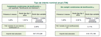 La hipoteca mixta de Unicaja destaca por un tipo inicial estable y competitivo durante los primeros 10 años. Accediendo a todas las bonificaciones, el TIN empieza en un 2.85%, y el variable posterior se sitúa en euríbor +0.95%, y una TAE del 3.93%.
