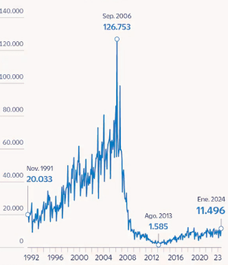 Este déficit estructural explica por qué, incluso con cierta mejora en la construcción, la oferta sigue muy por debajo de lo necesario para atender a los nuevos hogares que se adquieren cada año.
