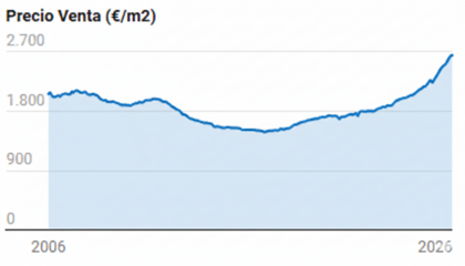 Según los últimos datos del mercado inmobiliario, el precio medio de la vivienda usada en España en enero de 2026 se situó en 2.650€/m²,lo que supone una subida interanual del 18.4%, el nivel más alto registrado en los últimos años.