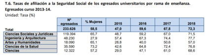 - Respecto al sexo: La rama de Ciencias, Artes y Humanidades y Ciencias de la Salud la tasa de afiliación de las mujeres supera a la de los hombres, mientras ocurre justo lo contrario en la rama de Ingeniería y Arquitectura.