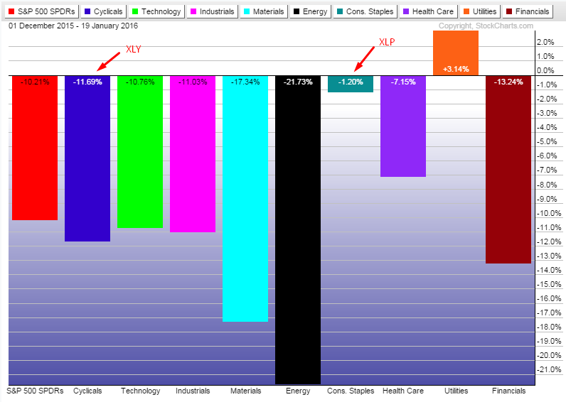 Una relación que resulta interesante es la del sector de consumo cíclico (XLY) y la del consumo de productos básicos (XLP)