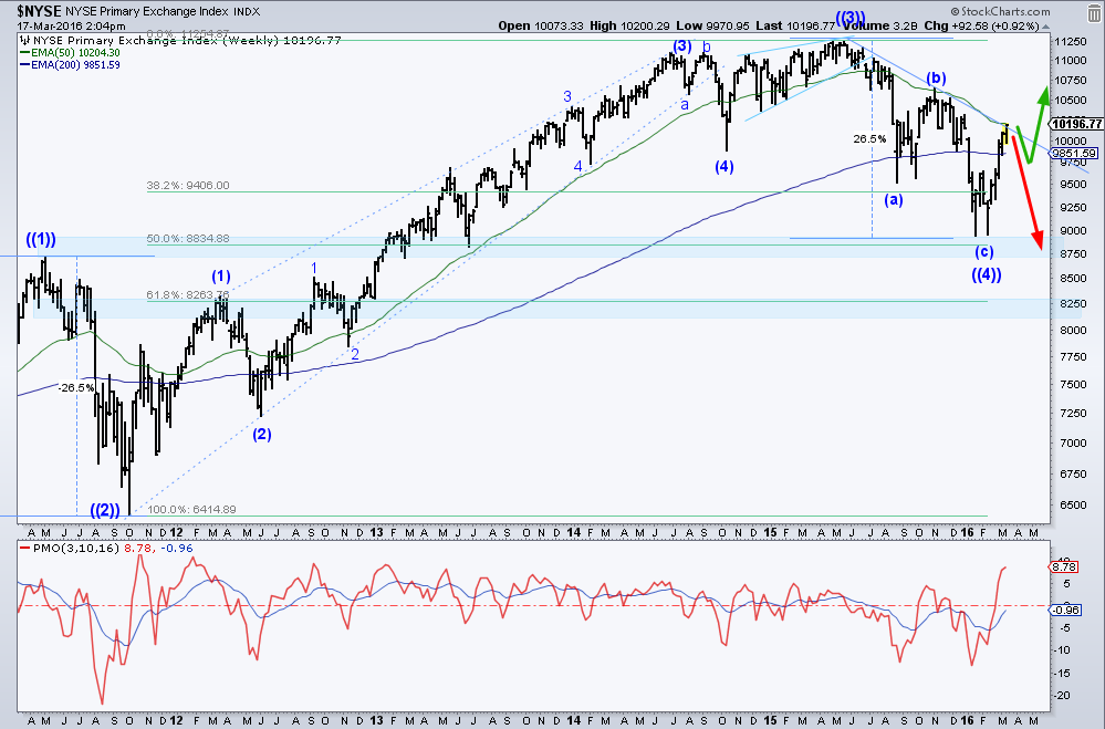 Mirando el gráfico semanal del NYSE uno se da cuenta que hemos llegado a un punto muy importante. Es el momento que determinará el comportamiento futuro de los índices americanos y por extensión mundiales.