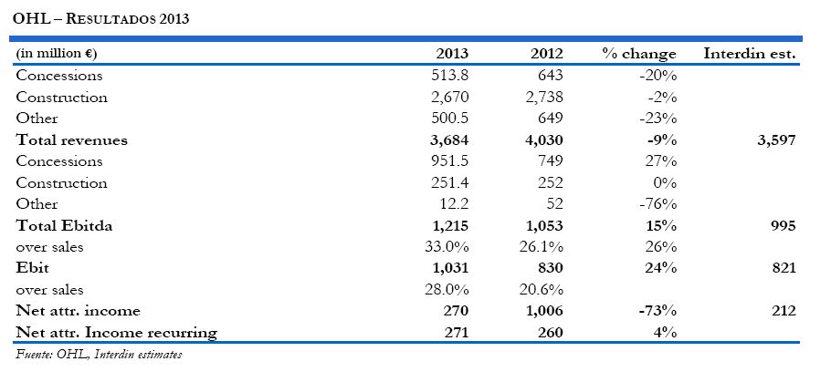 - Guidance 2014: de una manera algo vaga, la compañía ha comunicado que espera crecimientos mínimos del 10% en ventas, EBITDA y beneficio neto recurrente en 2014 y que mantendrá una ratio de deuda neta corn recurso / EBITDA con recurso inferior a 3,0x. Asimismo, el presidente ha indicado que esperan que la división de construcción muestre crecimiento en 2014 y que las actividades de industrial y servicios doblen sus ventas en el ejercicio en curso.