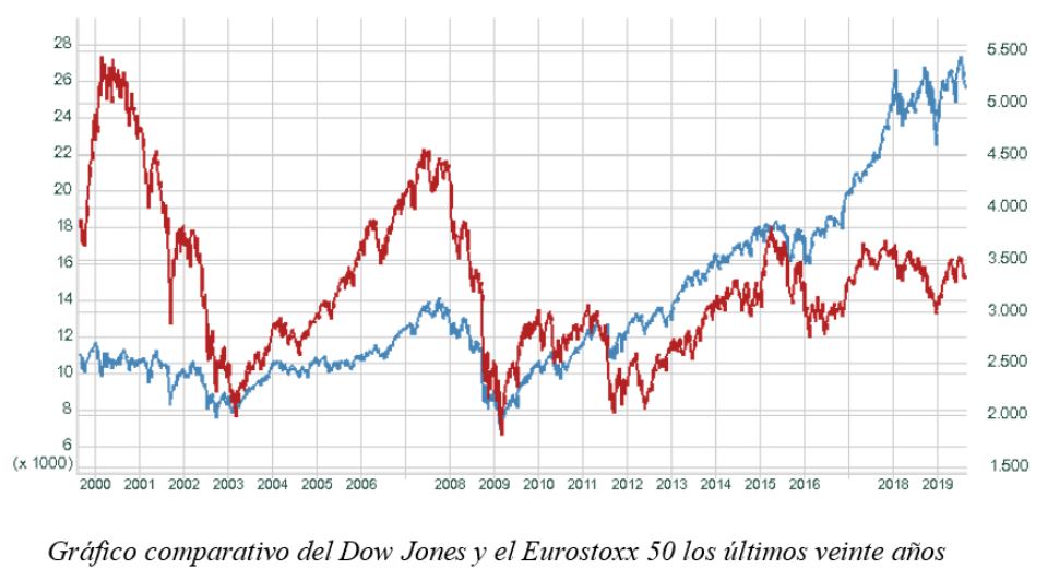 En cierto modo los fundamentales (Per, dividendo...) son mejores en las compañías europeas que en las americanas, y, como se ve en el Gráfico adjunto, el Dow Jones y los restantes índices americanos han más que duplicado los niveles que tenían a fines de 1999, antes del estallido de la burbuja de las puntocom, mientras que el Eurostoxx ha bajado desde los niveles de 5.000 puntos que tenía entonces a los actuales de 3.300 puntos.