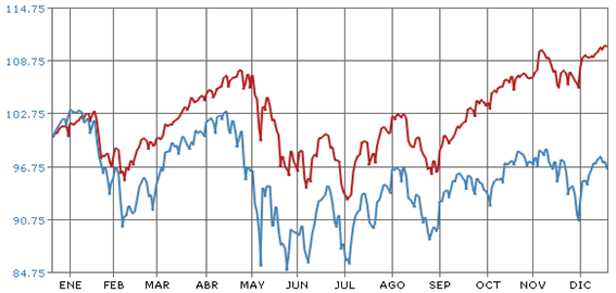 GRÁFICO DEL EUROSTOXX COMPARADO CON EL DOW JONES EL ULTIMO AÑO